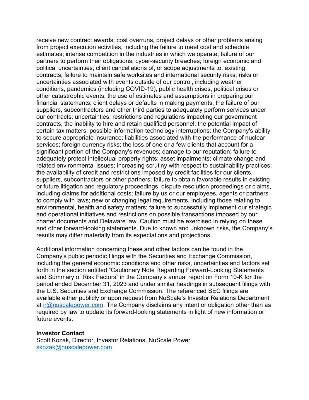 receive new contract awards; cost overruns, project delays or other problems arising from project execution activities, including the failure to meet cost and schedule estimates; intense competition in the industries in which we operate; failure of our partners to perform their obligations; cyber-security breaches; foreign economic and political uncertainties; client cancellations of, or scope adjustments to, existing contracts; failure to maintain safe worksites and international security risks; risks or uncertainties associated with events outside of our control, including weather conditions, pandemics (including COVID-19), public health crises, political crises or other catastrophic events; the use of estimates and assumptions in preparing our financial statements; client delays or defaults in making payments; the failure of our suppliers, subcontractors and other third parties to adequately perform services under our contracts; uncertainties, restrictions and regulations impacting our government contracts; the inability to hire and retain qualified personnel; the potential impact of certain tax matters; possible information technology interruptions; the Company's ability to secure appropriate insurance; liabilities associated with the performance of nuclear services; foreign currency risks; the loss of one or a few clients that account for a significant portion of the Company's revenues; damage to our reputation; failure to adequately protect intellectual property rights; asset impairments; climate change and related environmental issues; increasing scrutiny with respect to sustainability practices; the availability of credit and restrictions imposed by credit facilities for our clients, suppliers, subcontractors or other partners; failure to obtain favorable results in existing or future litigation and regulatory proceedings, dispute resolution proceedings or claims, including claims for additional costs; failure by us or our employees, agents or partners to comply with laws; new or changing legal requirements, including those relating to environmental, health and safety matters; failure to successfully implement our strategic and operational initiatives and restrictions on possible transactions imposed by our charter documents and Delaware law. Caution must be exercised in relying on these and other forward-looking statements. Due to known and unknown risks, the Company’s results may differ materially from its expectations and projections. Additional information concerning these and other factors can be found in the Company's public periodic filings with the Securities and Exchange Commission, including the general economic conditions and other risks, uncertainties and factors set forth in the section entitled “Cautionary Note Regarding Forward-Looking Statements and Summary of Risk Factors” in the Company’s annual report on Form 10-K for the period ended December 31, 2023 and under similar headings in subsequent filings with the U.S. Securities and Exchange Commission. The referenced SEC filings are available either publicly or upon request from NuScale's Investor Relations Department at ir@nuscalepower.com. The Company disclaims any intent or obligation other than as required by law to update its forward-looking statements in light of new information or future events. Investor Contact Scott Kozak, Director, Investor Relations, NuScale Power skozak@nuscalepower.com