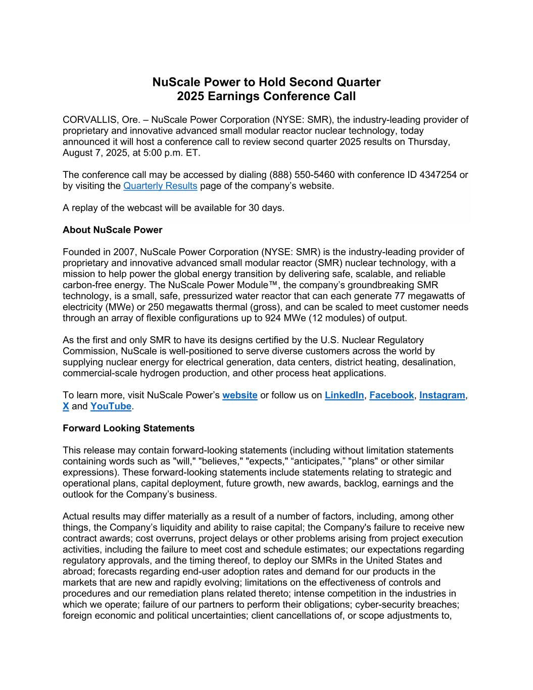 NuScale Power to Hold Second Quarter 2025 Earnings Conference Call CORVALLIS, Ore. – NuScale Power Corporation (NYSE: SMR), the industry-leading provider of proprietary and innovative advanced small modular reactor nuclear technology, today announced it will host a conference call to review second quarter 2025 results on Thursday, August 7, 2025, at 5:00 p.m. ET. The conference call may be accessed by dialing (888) 550-5460 with conference ID 4347254 or by visiting the Quarterly Results page of the company’s website. A replay of the webcast will be available for 30 days. About NuScale Power Founded in 2007, NuScale Power Corporation (NYSE: SMR) is the industry-leading provider of proprietary and innovative advanced small modular reactor (SMR) nuclear technology, with a mission to help power the global energy transition by delivering safe, scalable, and reliable carbon-free energy. The NuScale Power Module™, the company’s groundbreaking SMR technology, is a small, safe, pressurized water reactor that can each generate 77 megawatts of electricity (MWe) or 250 megawatts thermal (gross), and can be scaled to meet customer needs through an array of flexible configurations up to 924 MWe (12 modules) of output. As the first and only SMR to have its designs certified by the U.S. Nuclear Regulatory Commission, NuScale is well-positioned to serve diverse customers across the world by supplying nuclear energy for electrical generation, data centers, district heating, desalination, commercial-scale hydrogen production, and other process heat applications. To learn more, visit NuScale Power’s website or follow us on LinkedIn, Facebook, Instagram, X and YouTube. Forward Looking Statements This release may contain forward-looking statements (including without limitation statements containing words such as "will," "believes," "expects," “anticipates,” "plans" or other similar expressions). These forward-looking statements include statements relating to strategic and operational plans, capital deployment, future growth, new awards, backlog, earnings and the outlook for the Company’s business. Actual results may differ materially as a result of a number of factors, including, among other things, the Company’s liquidity and ability to raise capital; the Company's failure to receive new contract awards; cost overruns, project delays or other problems arising from project execution activities, including the failure to meet cost and schedule estimates; our expectations regarding regulatory approvals, and the timing thereof, to deploy our SMRs in the United States and abroad; forecasts regarding end-user adoption rates and demand for our products in the markets that are new and rapidly evolving; limitations on the effectiveness of controls and procedures and our remediation plans related thereto; intense competition in the industries in which we operate; failure of our partners to perform their obligations; cyber-security breaches; foreign economic and political uncertainties; client cancellations of, or scope adjustments to,