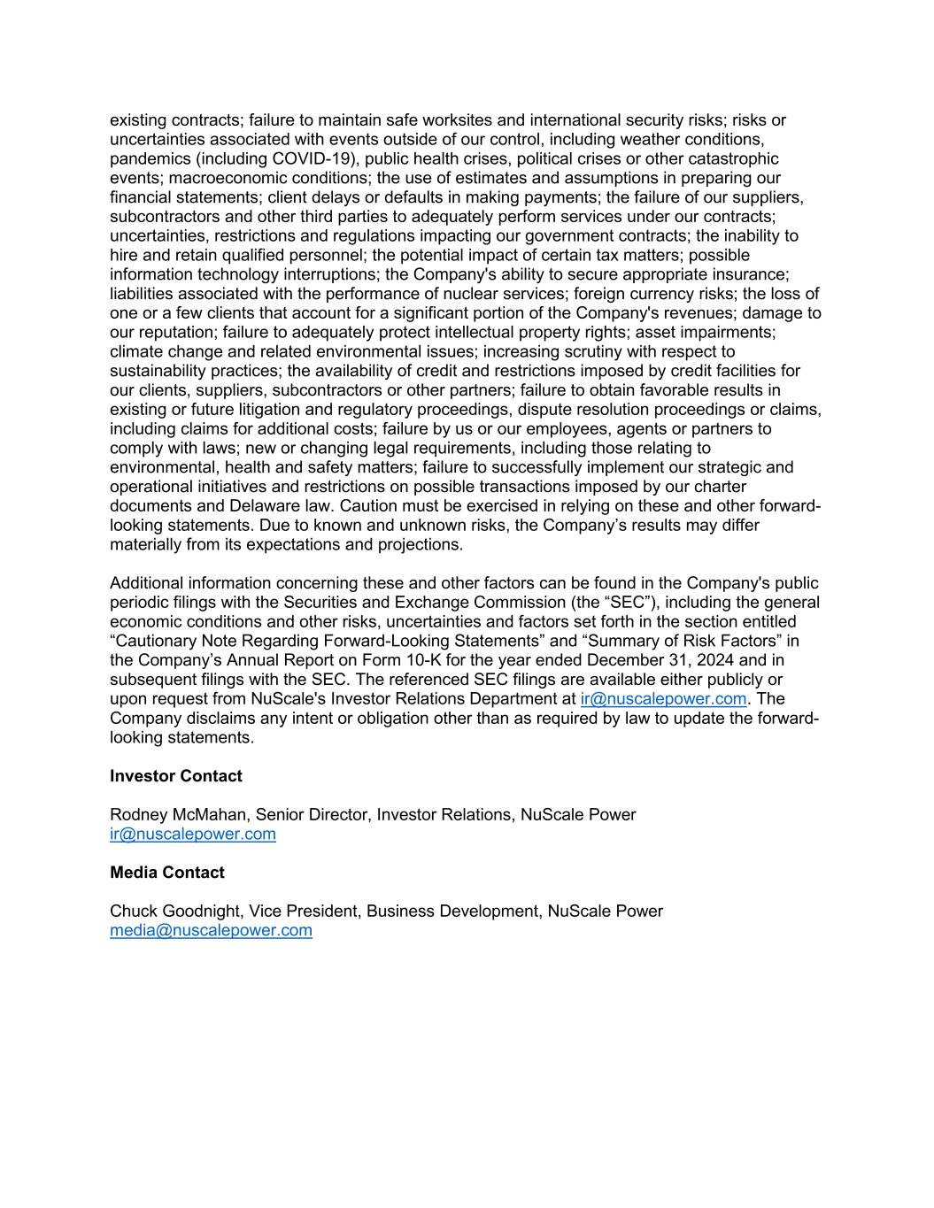 existing contracts; failure to maintain safe worksites and international security risks; risks or uncertainties associated with events outside of our control, including weather conditions, pandemics (including COVID-19), public health crises, political crises or other catastrophic events; macroeconomic conditions; the use of estimates and assumptions in preparing our financial statements; client delays or defaults in making payments; the failure of our suppliers, subcontractors and other third parties to adequately perform services under our contracts; uncertainties, restrictions and regulations impacting our government contracts; the inability to hire and retain qualified personnel; the potential impact of certain tax matters; possible information technology interruptions; the Company's ability to secure appropriate insurance; liabilities associated with the performance of nuclear services; foreign currency risks; the loss of one or a few clients that account for a significant portion of the Company's revenues; damage to our reputation; failure to adequately protect intellectual property rights; asset impairments; climate change and related environmental issues; increasing scrutiny with respect to sustainability practices; the availability of credit and restrictions imposed by credit facilities for our clients, suppliers, subcontractors or other partners; failure to obtain favorable results in existing or future litigation and regulatory proceedings, dispute resolution proceedings or claims, including claims for additional costs; failure by us or our employees, agents or partners to comply with laws; new or changing legal requirements, including those relating to environmental, health and safety matters; failure to successfully implement our strategic and operational initiatives and restrictions on possible transactions imposed by our charter documents and Delaware law. Caution must be exercised in relying on these and other forward- looking statements. Due to known and unknown risks, the Company’s results may differ materially from its expectations and projections. Additional information concerning these and other factors can be found in the Company's public periodic filings with the Securities and Exchange Commission (the “SEC”), including the general economic conditions and other risks, uncertainties and factors set forth in the section entitled “Cautionary Note Regarding Forward-Looking Statements” and “Summary of Risk Factors” in the Company’s Annual Report on Form 10-K for the year ended December 31, 2024 and in subsequent filings with the SEC. The referenced SEC filings are available either publicly or upon request from NuScale's Investor Relations Department at ir@nuscalepower.com. The Company disclaims any intent or obligation other than as required by law to update the forward- looking statements. Investor Contact Rodney McMahan, Senior Director, Investor Relations, NuScale Power ir@nuscalepower.com Media Contact Chuck Goodnight, Vice President, Business Development, NuScale Power media@nuscalepower.com