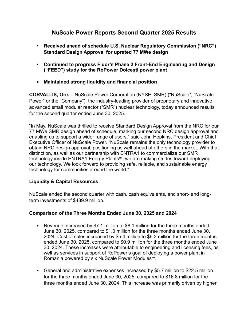 NuScale Power Reports Second Quarter 2025 Results • Received ahead of schedule U.S. Nuclear Regulatory Commission (“NRC”) Standard Design Approval for uprated 77 MWe design • Continued to progress Fluor’s Phase 2 Front-End Engineering and Design (“FEED”) study for the RoPower Doicești power plant • Maintained strong liquidity and financial position CORVALLIS, Ore. – NuScale Power Corporation (NYSE: SMR) (“NuScale”, “NuScale Power” or the “Company”), the industry-leading provider of proprietary and innovative advanced small modular reactor (“SMR”) nuclear technology, today announced results for the second quarter ended June 30, 2025. “In May, NuScale was thrilled to receive Standard Design Approval from the NRC for our 77 MWe SMR design ahead of schedule, marking our second NRC design approval and enabling us to support a wider range of users,” said John Hopkins, President and Chief Executive Officer of NuScale Power. “NuScale remains the only technology provider to obtain NRC design approval, positioning us well ahead of others in the market. With that distinction, as well as our partnership with ENTRA1 to commercialize our SMR technology inside ENTRA1 Energy Plants™, we are making strides toward deploying our technology. We look forward to providing safe, reliable, and sustainable energy technology for communities around the world.” Liquidity & Capital Resources NuScale ended the second quarter with cash, cash equivalents, and short- and long- term investments of $489.9 million. Comparison of the Three Months Ended June 30, 2025 and 2024 • Revenue increased by $7.1 million to $8.1 million for the three months ended June 30, 2025, compared to $1.0 million for the three months ended June 30, 2024. Cost of sales increased by $5.4 million to $6.3 million for the three months ended June 30, 2025, compared to $0.9 million for the three months ended June 30, 2024. These increases were attributable to engineering and licensing fees, as well as services in support of RoPower’s goal of deploying a power plant in Romania powered by six NuScale Power Modules™. • General and administrative expenses increased by $5.7 million to $22.5 million for the three months ended June 30, 2025, compared to $16.8 million for the three months ended June 30, 2024. This increase was primarily driven by higher