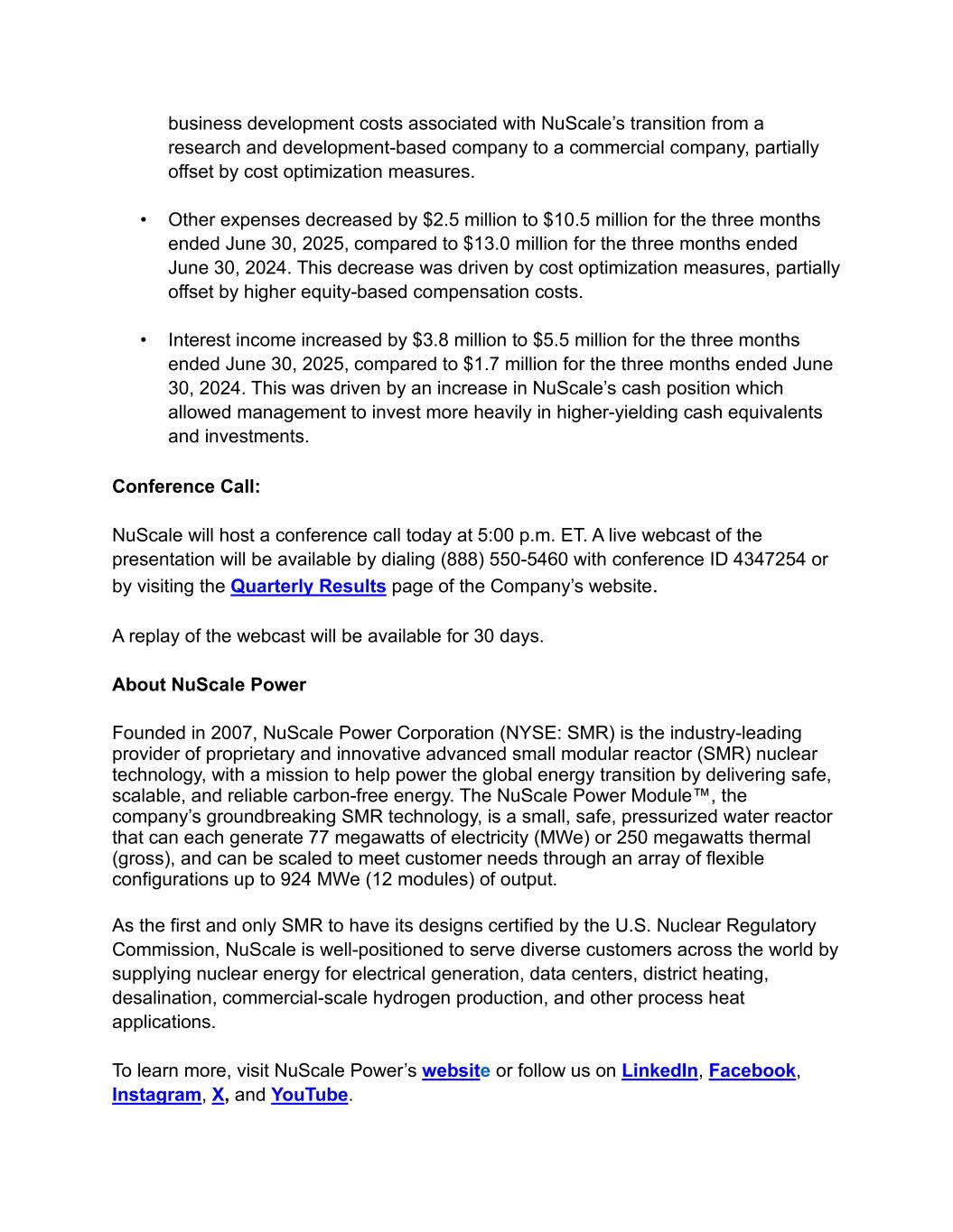 business development costs associated with NuScale’s transition from a research and development-based company to a commercial company, partially offset by cost optimization measures. • Other expenses decreased by $2.5 million to $10.5 million for the three months ended June 30, 2025, compared to $13.0 million for the three months ended June 30, 2024. This decrease was driven by cost optimization measures, partially offset by higher equity-based compensation costs. • Interest income increased by $3.8 million to $5.5 million for the three months ended June 30, 2025, compared to $1.7 million for the three months ended June 30, 2024. This was driven by an increase in NuScale’s cash position which allowed management to invest more heavily in higher-yielding cash equivalents and investments. Conference Call: NuScale will host a conference call today at 5:00 p.m. ET. A live webcast of the presentation will be available by dialing (888) 550-5460 with conference ID 4347254 or by visiting the Quarterly Results page of the Company’s website. A replay of the webcast will be available for 30 days. About NuScale Power Founded in 2007, NuScale Power Corporation (NYSE: SMR) is the industry-leading provider of proprietary and innovative advanced small modular reactor (SMR) nuclear technology, with a mission to help power the global energy transition by delivering safe, scalable, and reliable carbon-free energy. The NuScale Power Module™, the company’s groundbreaking SMR technology, is a small, safe, pressurized water reactor that can each generate 77 megawatts of electricity (MWe) or 250 megawatts thermal (gross), and can be scaled to meet customer needs through an array of flexible configurations up to 924 MWe (12 modules) of output. As the first and only SMR to have its designs certified by the U.S. Nuclear Regulatory Commission, NuScale is well-positioned to serve diverse customers across the world by supplying nuclear energy for electrical generation, data centers, district heating, desalination, commercial-scale hydrogen production, and other process heat applications. To learn more, visit NuScale Power’s website or follow us on LinkedIn, Facebook, Instagram, X, and YouTube.