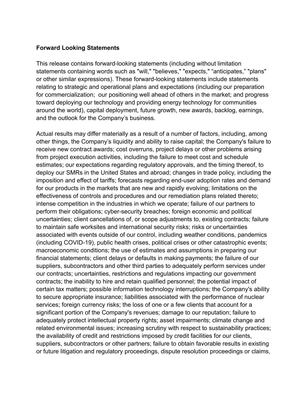 Forward Looking Statements This release contains forward-looking statements (including without limitation statements containing words such as "will," "believes," "expects," “anticipates,” "plans" or other similar expressions). These forward-looking statements include statements relating to strategic and operational plans and expectations (including our preparation for commercialization; our positioning well ahead of others in the market; and progress toward deploying our technology and providing energy technology for communities around the world), capital deployment, future growth, new awards, backlog, earnings, and the outlook for the Company’s business. Actual results may differ materially as a result of a number of factors, including, among other things, the Company’s liquidity and ability to raise capital; the Company's failure to receive new contract awards; cost overruns, project delays or other problems arising from project execution activities, including the failure to meet cost and schedule estimates; our expectations regarding regulatory approvals, and the timing thereof, to deploy our SMRs in the United States and abroad; changes in trade policy, including the imposition and effect of tariffs; forecasts regarding end-user adoption rates and demand for our products in the markets that are new and rapidly evolving; limitations on the effectiveness of controls and procedures and our remediation plans related thereto; intense competition in the industries in which we operate; failure of our partners to perform their obligations; cyber-security breaches; foreign economic and political uncertainties; client cancellations of, or scope adjustments to, existing contracts; failure to maintain safe worksites and international security risks; risks or uncertainties associated with events outside of our control, including weather conditions, pandemics (including COVID-19), public health crises, political crises or other catastrophic events; macroeconomic conditions; the use of estimates and assumptions in preparing our financial statements; client delays or defaults in making payments; the failure of our suppliers, subcontractors and other third parties to adequately perform services under our contracts; uncertainties, restrictions and regulations impacting our government contracts; the inability to hire and retain qualified personnel; the potential impact of certain tax matters; possible information technology interruptions; the Company's ability to secure appropriate insurance; liabilities associated with the performance of nuclear services; foreign currency risks; the loss of one or a few clients that account for a significant portion of the Company's revenues; damage to our reputation; failure to adequately protect intellectual property rights; asset impairments; climate change and related environmental issues; increasing scrutiny with respect to sustainability practices; the availability of credit and restrictions imposed by credit facilities for our clients, suppliers, subcontractors or other partners; failure to obtain favorable results in existing or future litigation and regulatory proceedings, dispute resolution proceedings or claims,