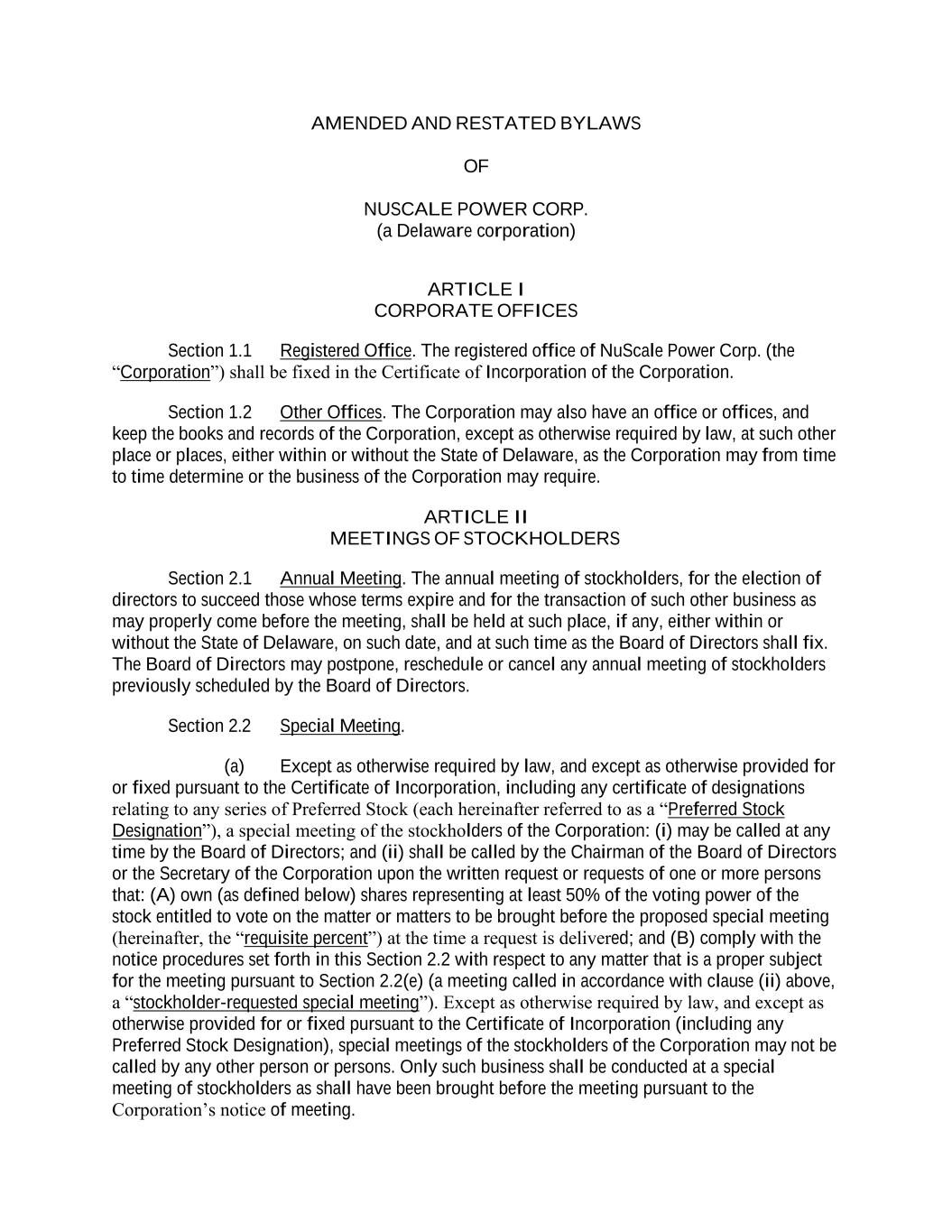 AMENDED AND RESTATED BYLAWS OF NUSCALE POWER CORP. (a Delaware corporation) ARTICLE I CORPORATE OFFICES Section 1.1 Registered Office. The registered office of NuScale Power Corp. (the “Corporation”) shall be fixed in the Certificate of Incorporation of the Corporation. Section 1.2 Other Offices. The Corporation may also have an office or offices, and keep the books and records of the Corporation, except as otherwise required by law, at such other place or places, either within or without the State of Delaware, as the Corporation may from time to time determine or the business of the Corporation may require. ARTICLE II MEETINGS OF STOCKHOLDERS Section 2.1 Annual Meeting. The annual meeting of stockholders, for the election of directors to succeed those whose terms expire and for the transaction of such other business as may properly come before the meeting, shall be held at such place, if any, either within or without the State of Delaware, on such date, and at such time as the Board of Directors shall fix. The Board of Directors may postpone, reschedule or cancel any annual meeting of stockholders previously scheduled by the Board of Directors. Section 2.2 Special Meeting. (a) Except as otherwise required by law, and except as otherwise provided for or fixed pursuant to the Certificate of Incorporation, including any certificate of designations relating to any series of Preferred Stock (each hereinafter referred to as a “Preferred Stock Designation”), a special meeting of the stockholders of the Corporation: (i) may be called at any time by the Board of Directors; and (ii) shall be called by the Chairman of the Board of Directors or the Secretary of the Corporation upon the written request or requests of one or more persons that: (A) own (as defined below) shares representing at least 50% of the voting power of the stock entitled to vote on the matter or matters to be brought before the proposed special meeting (hereinafter, the “requisite percent”) at the time a request is delivered; and (B) comply with the notice procedures set forth in this Section 2.2 with respect to any matter that is a proper subject for the meeting pursuant to Section 2.2(e) (a meeting called in accordance with clause (ii) above, a “stockholder-requested special meeting”). Except as otherwise required by law, and except as otherwise provided for or fixed pursuant to the Certificate of Incorporation (including any Preferred Stock Designation), special meetings of the stockholders of the Corporation may not be called by any other person or persons. Only such business shall be conducted at a special meeting of stockholders as shall have been brought before the meeting pursuant to the Corporation’s notice of meeting.