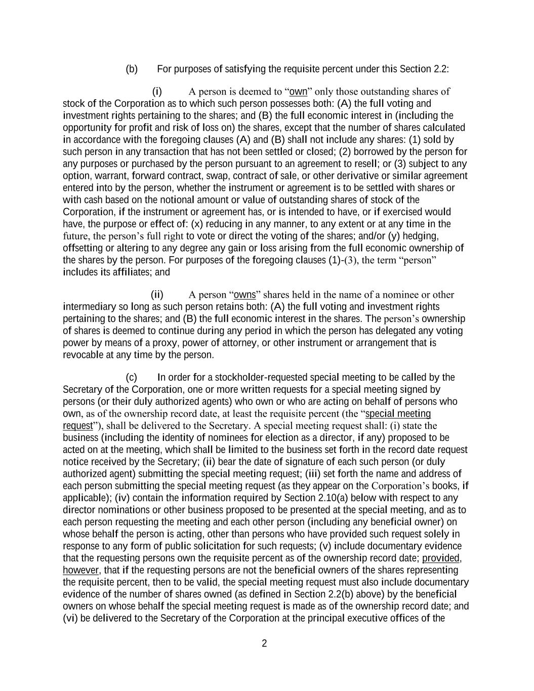 2 (b) For purposes of satisfying the requisite percent under this Section 2.2: (i) A person is deemed to “own” only those outstanding shares of stock of the Corporation as to which such person possesses both: (A) the full voting and investment rights pertaining to the shares; and (B) the full economic interest in (including the opportunity for profit and risk of loss on) the shares, except that the number of shares calculated in accordance with the foregoing clauses (A) and (B) shall not include any shares: (1) sold by such person in any transaction that has not been settled or closed; (2) borrowed by the person for any purposes or purchased by the person pursuant to an agreement to resell; or (3) subject to any option, warrant, forward contract, swap, contract of sale, or other derivative or similar agreement entered into by the person, whether the instrument or agreement is to be settled with shares or with cash based on the notional amount or value of outstanding shares of stock of the Corporation, if the instrument or agreement has, or is intended to have, or if exercised would have, the purpose or effect of: (x) reducing in any manner, to any extent or at any time in the future, the person’s full right to vote or direct the voting of the shares; and/or (y) hedging, offsetting or altering to any degree any gain or loss arising from the full economic ownership of the shares by the person. For purposes of the foregoing clauses (1)-(3), the term “person” includes its affiliates; and (ii) A person “owns” shares held in the name of a nominee or other intermediary so long as such person retains both: (A) the full voting and investment rights pertaining to the shares; and (B) the full economic interest in the shares. The person’s ownership of shares is deemed to continue during any period in which the person has delegated any voting power by means of a proxy, power of attorney, or other instrument or arrangement that is revocable at any time by the person. (c) In order for a stockholder-requested special meeting to be called by the Secretary of the Corporation, one or more written requests for a special meeting signed by persons (or their duly authorized agents) who own or who are acting on behalf of persons who own, as of the ownership record date, at least the requisite percent (the “special meeting request”), shall be delivered to the Secretary. A special meeting request shall: (i) state the business (including the identity of nominees for election as a director, if any) proposed to be acted on at the meeting, which shall be limited to the business set forth in the record date request notice received by the Secretary; (ii) bear the date of signature of each such person (or duly authorized agent) submitting the special meeting request; (iii) set forth the name and address of each person submitting the special meeting request (as they appear on the Corporation’s books, if applicable); (iv) contain the information required by Section 2.10(a) below with respect to any director nominations or other business proposed to be presented at the special meeting, and as to each person requesting the meeting and each other person (including any beneficial owner) on whose behalf the person is acting, other than persons who have provided such request solely in response to any form of public solicitation for such requests; (v) include documentary evidence that the requesting persons own the requisite percent as of the ownership record date; provided, however, that if the requesting persons are not the beneficial owners of the shares representing the requisite percent, then to be valid, the special meeting request must also include documentary evidence of the number of shares owned (as defined in Section 2.2(b) above) by the beneficial owners on whose behalf the special meeting request is made as of the ownership record date; and (vi) be delivered to the Secretary of the Corporation at the principal executive offices of the