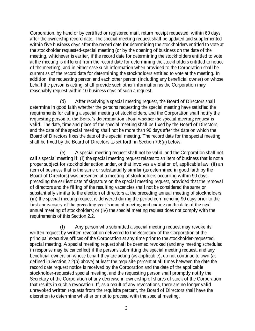 3 Corporation, by hand or by certified or registered mail, return receipt requested, within 60 days after the ownership record date. The special meeting request shall be updated and supplemented within five business days after the record date for determining the stockholders entitled to vote at the stockholder requested-special meeting (or by the opening of business on the date of the meeting, whichever is earlier, if the record date for determining the stockholders entitled to vote at the meeting is different from the record date for determining the stockholders entitled to notice of the meeting), and in either case such information when provided to the Corporation shall be current as of the record date for determining the stockholders entitled to vote at the meeting. In addition, the requesting person and each other person (including any beneficial owner) on whose behalf the person is acting, shall provide such other information as the Corporation may reasonably request within 10 business days of such a request. (d) After receiving a special meeting request, the Board of Directors shall determine in good faith whether the persons requesting the special meeting have satisfied the requirements for calling a special meeting of stockholders, and the Corporation shall notify the requesting person of the Board’s determination about whether the special meeting request is valid. The date, time and place of the special meeting shall be fixed by the Board of Directors, and the date of the special meeting shall not be more than 90 days after the date on which the Board of Directors fixes the date of the special meeting. The record date for the special meeting shall be fixed by the Board of Directors as set forth in Section 7.6(a) below. (e) A special meeting request shall not be valid, and the Corporation shall not call a special meeting if: (i) the special meeting request relates to an item of business that is not a proper subject for stockholder action under, or that involves a violation of, applicable law; (ii) an item of business that is the same or substantially similar (as determined in good faith by the Board of Directors) was presented at a meeting of stockholders occurring within 90 days preceding the earliest date of signature on the special meeting request, provided that the removal of directors and the filling of the resulting vacancies shall not be considered the same or substantially similar to the election of directors at the preceding annual meeting of stockholders; (iii) the special meeting request is delivered during the period commencing 90 days prior to the first anniversary of the preceding year’s annual meeting and ending on the date of the next annual meeting of stockholders; or (iv) the special meeting request does not comply with the requirements of this Section 2.2. (f) Any person who submitted a special meeting request may revoke its written request by written revocation delivered to the Secretary of the Corporation at the principal executive offices of the Corporation at any time prior to the stockholder-requested special meeting. A special meeting request shall be deemed revoked (and any meeting scheduled in response may be cancelled) if the persons submitting the special meeting request, and any beneficial owners on whose behalf they are acting (as applicable), do not continue to own (as defined in Section 2.2(b) above) at least the requisite percent at all times between the date the record date request notice is received by the Corporation and the date of the applicable stockholder-requested special meeting, and the requesting person shall promptly notify the Secretary of the Corporation of any decrease in ownership of shares of stock of the Corporation that results in such a revocation. If, as a result of any revocations, there are no longer valid unrevoked written requests from the requisite percent, the Board of Directors shall have the discretion to determine whether or not to proceed with the special meeting.