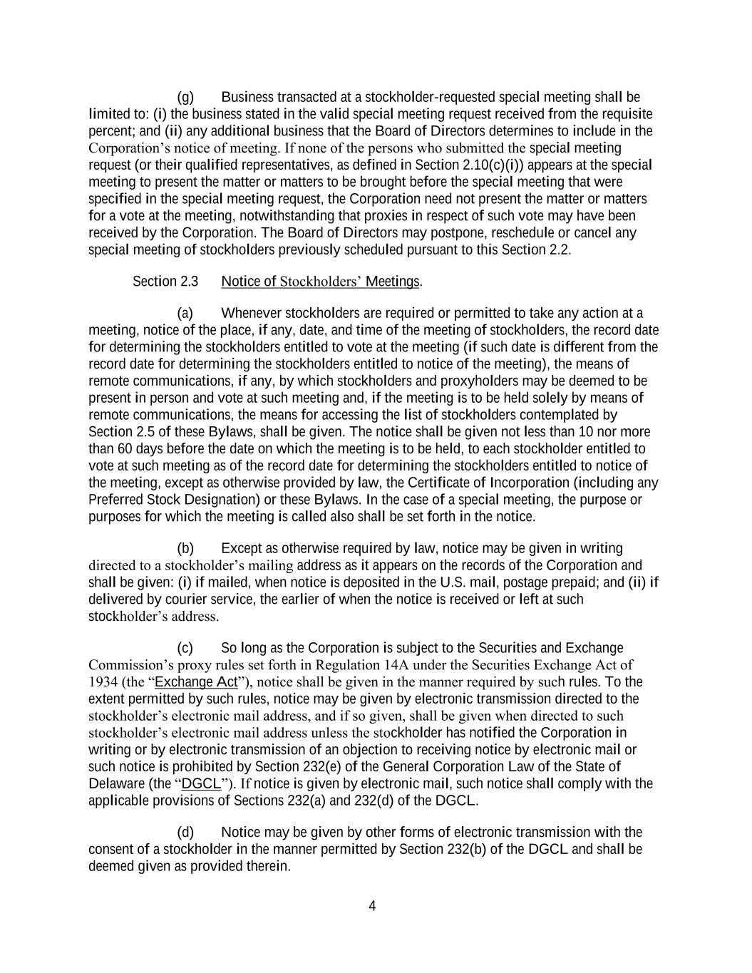 4 (g) Business transacted at a stockholder-requested special meeting shall be limited to: (i) the business stated in the valid special meeting request received from the requisite percent; and (ii) any additional business that the Board of Directors determines to include in the Corporation’s notice of meeting. If none of the persons who submitted the special meeting request (or their qualified representatives, as defined in Section 2.10(c)(i)) appears at the special meeting to present the matter or matters to be brought before the special meeting that were specified in the special meeting request, the Corporation need not present the matter or matters for a vote at the meeting, notwithstanding that proxies in respect of such vote may have been received by the Corporation. The Board of Directors may postpone, reschedule or cancel any special meeting of stockholders previously scheduled pursuant to this Section 2.2. Section 2.3 Notice of Stockholders’ Meetings. (a) Whenever stockholders are required or permitted to take any action at a meeting, notice of the place, if any, date, and time of the meeting of stockholders, the record date for determining the stockholders entitled to vote at the meeting (if such date is different from the record date for determining the stockholders entitled to notice of the meeting), the means of remote communications, if any, by which stockholders and proxyholders may be deemed to be present in person and vote at such meeting and, if the meeting is to be held solely by means of remote communications, the means for accessing the list of stockholders contemplated by Section 2.5 of these Bylaws, shall be given. The notice shall be given not less than 10 nor more than 60 days before the date on which the meeting is to be held, to each stockholder entitled to vote at such meeting as of the record date for determining the stockholders entitled to notice of the meeting, except as otherwise provided by law, the Certificate of Incorporation (including any Preferred Stock Designation) or these Bylaws. In the case of a special meeting, the purpose or purposes for which the meeting is called also shall be set forth in the notice. (b) Except as otherwise required by law, notice may be given in writing directed to a stockholder’s mailing address as it appears on the records of the Corporation and shall be given: (i) if mailed, when notice is deposited in the U.S. mail, postage prepaid; and (ii) if delivered by courier service, the earlier of when the notice is received or left at such stockholder’s address. (c) So long as the Corporation is subject to the Securities and Exchange Commission’s proxy rules set forth in Regulation 14A under the Securities Exchange Act of 1934 (the “Exchange Act”), notice shall be given in the manner required by such rules. To the extent permitted by such rules, notice may be given by electronic transmission directed to the stockholder’s electronic mail address, and if so given, shall be given when directed to such stockholder’s electronic mail address unless the stockholder has notified the Corporation in writing or by electronic transmission of an objection to receiving notice by electronic mail or such notice is prohibited by Section 232(e) of the General Corporation Law of the State of Delaware (the “DGCL”). If notice is given by electronic mail, such notice shall comply with the applicable provisions of Sections 232(a) and 232(d) of the DGCL. (d) Notice may be given by other forms of electronic transmission with the consent of a stockholder in the manner permitted by Section 232(b) of the DGCL and shall be deemed given as provided therein.