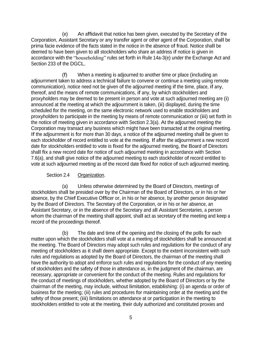 5 (e) An affidavit that notice has been given, executed by the Secretary of the Corporation, Assistant Secretary or any transfer agent or other agent of the Corporation, shall be prima facie evidence of the facts stated in the notice in the absence of fraud. Notice shall be deemed to have been given to all stockholders who share an address if notice is given in accordance with the “householding” rules set forth in Rule 14a-3(e) under the Exchange Act and Section 233 of the DGCL. (f) When a meeting is adjourned to another time or place (including an adjournment taken to address a technical failure to convene or continue a meeting using remote communication), notice need not be given of the adjourned meeting if the time, place, if any, thereof, and the means of remote communications, if any, by which stockholders and proxyholders may be deemed to be present in person and vote at such adjourned meeting are (i) announced at the meeting at which the adjournment is taken, (ii) displayed, during the time scheduled for the meeting, on the same electronic network used to enable stockholders and proxyholders to participate in the meeting by means of remote communication or (iii) set forth in the notice of meeting given in accordance with Section 2.3(a). At the adjourned meeting the Corporation may transact any business which might have been transacted at the original meeting. If the adjournment is for more than 30 days, a notice of the adjourned meeting shall be given to each stockholder of record entitled to vote at the meeting. If after the adjournment a new record date for stockholders entitled to vote is fixed for the adjourned meeting, the Board of Directors shall fix a new record date for notice of such adjourned meeting in accordance with Section 7.6(a), and shall give notice of the adjourned meeting to each stockholder of record entitled to vote at such adjourned meeting as of the record date fixed for notice of such adjourned meeting. Section 2.4 Organization. (a) Unless otherwise determined by the Board of Directors, meetings of stockholders shall be presided over by the Chairman of the Board of Directors, or in his or her absence, by the Chief Executive Officer or, in his or her absence, by another person designated by the Board of Directors. The Secretary of the Corporation, or in his or her absence, an Assistant Secretary, or in the absence of the Secretary and all Assistant Secretaries, a person whom the chairman of the meeting shall appoint, shall act as secretary of the meeting and keep a record of the proceedings thereof. (b) The date and time of the opening and the closing of the polls for each matter upon which the stockholders shall vote at a meeting of stockholders shall be announced at the meeting. The Board of Directors may adopt such rules and regulations for the conduct of any meeting of stockholders as it shall deem appropriate. Except to the extent inconsistent with such rules and regulations as adopted by the Board of Directors, the chairman of the meeting shall have the authority to adopt and enforce such rules and regulations for the conduct of any meeting of stockholders and the safety of those in attendance as, in the judgment of the chairman, are necessary, appropriate or convenient for the conduct of the meeting. Rules and regulations for the conduct of meetings of stockholders, whether adopted by the Board of Directors or by the chairman of the meeting, may include, without limitation, establishing: (i) an agenda or order of business for the meeting; (ii) rules and procedures for maintaining order at the meeting and the safety of those present; (iii) limitations on attendance at or participation in the meeting to stockholders entitled to vote at the meeting, their duly authorized and constituted proxies and