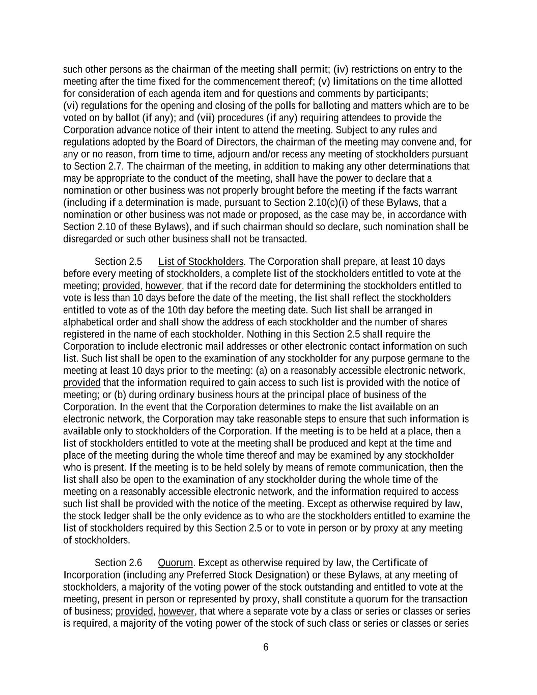 6 such other persons as the chairman of the meeting shall permit; (iv) restrictions on entry to the meeting after the time fixed for the commencement thereof; (v) limitations on the time allotted for consideration of each agenda item and for questions and comments by participants; (vi) regulations for the opening and closing of the polls for balloting and matters which are to be voted on by ballot (if any); and (vii) procedures (if any) requiring attendees to provide the Corporation advance notice of their intent to attend the meeting. Subject to any rules and regulations adopted by the Board of Directors, the chairman of the meeting may convene and, for any or no reason, from time to time, adjourn and/or recess any meeting of stockholders pursuant to Section 2.7. The chairman of the meeting, in addition to making any other determinations that may be appropriate to the conduct of the meeting, shall have the power to declare that a nomination or other business was not properly brought before the meeting if the facts warrant (including if a determination is made, pursuant to Section 2.10(c)(i) of these Bylaws, that a nomination or other business was not made or proposed, as the case may be, in accordance with Section 2.10 of these Bylaws), and if such chairman should so declare, such nomination shall be disregarded or such other business shall not be transacted. Section 2.5 List of Stockholders. The Corporation shall prepare, at least 10 days before every meeting of stockholders, a complete list of the stockholders entitled to vote at the meeting; provided, however, that if the record date for determining the stockholders entitled to vote is less than 10 days before the date of the meeting, the list shall reflect the stockholders entitled to vote as of the 10th day before the meeting date. Such list shall be arranged in alphabetical order and shall show the address of each stockholder and the number of shares registered in the name of each stockholder. Nothing in this Section 2.5 shall require the Corporation to include electronic mail addresses or other electronic contact information on such list. Such list shall be open to the examination of any stockholder for any purpose germane to the meeting at least 10 days prior to the meeting: (a) on a reasonably accessible electronic network, provided that the information required to gain access to such list is provided with the notice of meeting; or (b) during ordinary business hours at the principal place of business of the Corporation. In the event that the Corporation determines to make the list available on an electronic network, the Corporation may take reasonable steps to ensure that such information is available only to stockholders of the Corporation. If the meeting is to be held at a place, then a list of stockholders entitled to vote at the meeting shall be produced and kept at the time and place of the meeting during the whole time thereof and may be examined by any stockholder who is present. If the meeting is to be held solely by means of remote communication, then the list shall also be open to the examination of any stockholder during the whole time of the meeting on a reasonably accessible electronic network, and the information required to access such list shall be provided with the notice of the meeting. Except as otherwise required by law, the stock ledger shall be the only evidence as to who are the stockholders entitled to examine the list of stockholders required by this Section 2.5 or to vote in person or by proxy at any meeting of stockholders. Section 2.6 Quorum. Except as otherwise required by law, the Certificate of Incorporation (including any Preferred Stock Designation) or these Bylaws, at any meeting of stockholders, a majority of the voting power of the stock outstanding and entitled to vote at the meeting, present in person or represented by proxy, shall constitute a quorum for the transaction of business; provided, however, that where a separate vote by a class or series or classes or series is required, a majority of the voting power of the stock of such class or series or classes or series