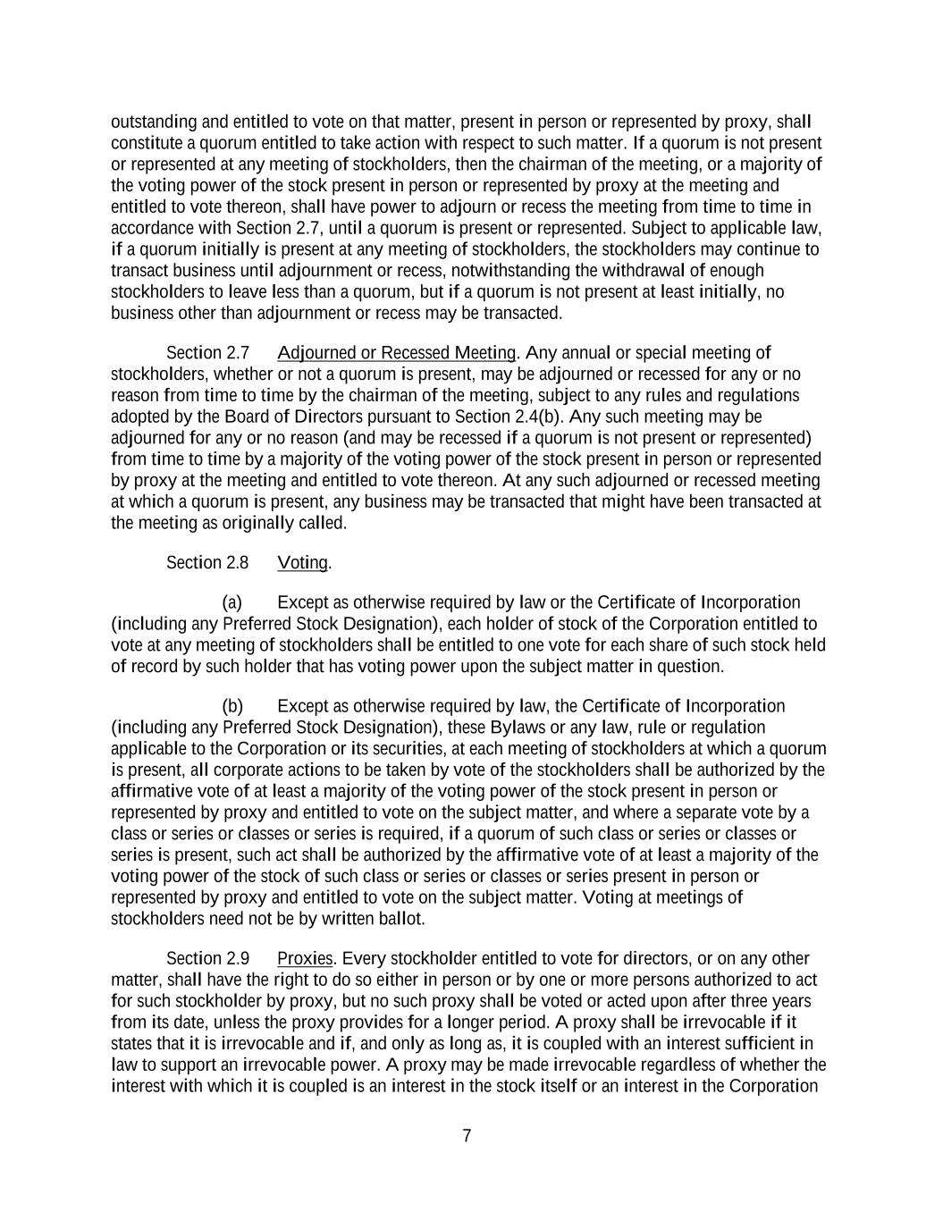 7 outstanding and entitled to vote on that matter, present in person or represented by proxy, shall constitute a quorum entitled to take action with respect to such matter. If a quorum is not present or represented at any meeting of stockholders, then the chairman of the meeting, or a majority of the voting power of the stock present in person or represented by proxy at the meeting and entitled to vote thereon, shall have power to adjourn or recess the meeting from time to time in accordance with Section 2.7, until a quorum is present or represented. Subject to applicable law, if a quorum initially is present at any meeting of stockholders, the stockholders may continue to transact business until adjournment or recess, notwithstanding the withdrawal of enough stockholders to leave less than a quorum, but if a quorum is not present at least initially, no business other than adjournment or recess may be transacted. Section 2.7 Adjourned or Recessed Meeting. Any annual or special meeting of stockholders, whether or not a quorum is present, may be adjourned or recessed for any or no reason from time to time by the chairman of the meeting, subject to any rules and regulations adopted by the Board of Directors pursuant to Section 2.4(b). Any such meeting may be adjourned for any or no reason (and may be recessed if a quorum is not present or represented) from time to time by a majority of the voting power of the stock present in person or represented by proxy at the meeting and entitled to vote thereon. At any such adjourned or recessed meeting at which a quorum is present, any business may be transacted that might have been transacted at the meeting as originally called. Section 2.8 Voting. (a) Except as otherwise required by law or the Certificate of Incorporation (including any Preferred Stock Designation), each holder of stock of the Corporation entitled to vote at any meeting of stockholders shall be entitled to one vote for each share of such stock held of record by such holder that has voting power upon the subject matter in question. (b) Except as otherwise required by law, the Certificate of Incorporation (including any Preferred Stock Designation), these Bylaws or any law, rule or regulation applicable to the Corporation or its securities, at each meeting of stockholders at which a quorum is present, all corporate actions to be taken by vote of the stockholders shall be authorized by the affirmative vote of at least a majority of the voting power of the stock present in person or represented by proxy and entitled to vote on the subject matter, and where a separate vote by a class or series or classes or series is required, if a quorum of such class or series or classes or series is present, such act shall be authorized by the affirmative vote of at least a majority of the voting power of the stock of such class or series or classes or series present in person or represented by proxy and entitled to vote on the subject matter. Voting at meetings of stockholders need not be by written ballot. Section 2.9 Proxies. Every stockholder entitled to vote for directors, or on any other matter, shall have the right to do so either in person or by one or more persons authorized to act for such stockholder by proxy, but no such proxy shall be voted or acted upon after three years from its date, unless the proxy provides for a longer period. A proxy shall be irrevocable if it states that it is irrevocable and if, and only as long as, it is coupled with an interest sufficient in law to support an irrevocable power. A proxy may be made irrevocable regardless of whether the interest with which it is coupled is an interest in the stock itself or an interest in the Corporation