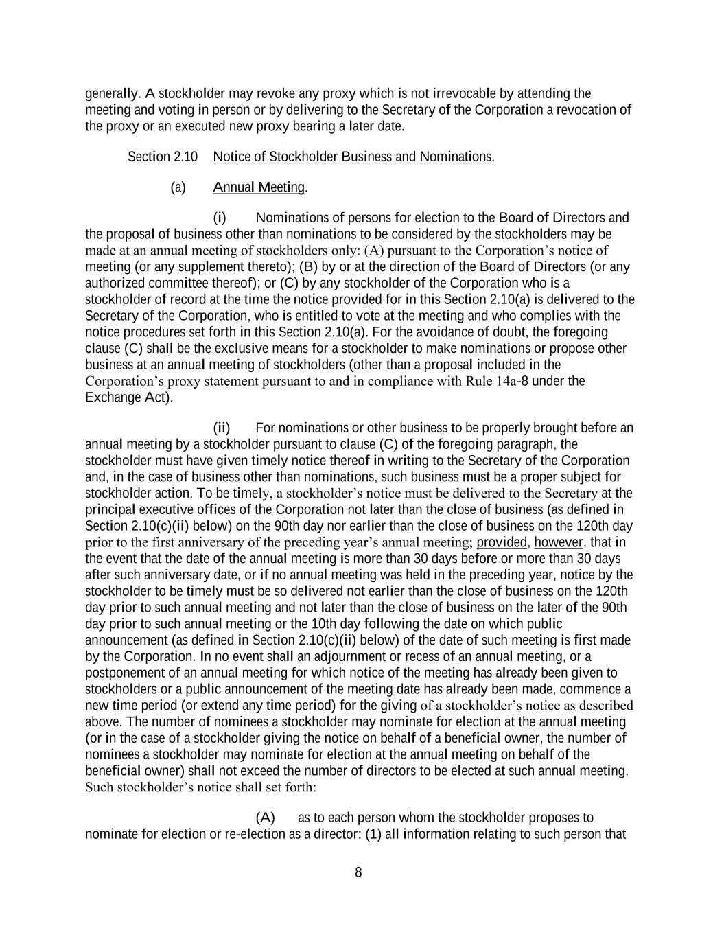 8 generally. A stockholder may revoke any proxy which is not irrevocable by attending the meeting and voting in person or by delivering to the Secretary of the Corporation a revocation of the proxy or an executed new proxy bearing a later date. Section 2.10 Notice of Stockholder Business and Nominations. (a) Annual Meeting. (i) Nominations of persons for election to the Board of Directors and the proposal of business other than nominations to be considered by the stockholders may be made at an annual meeting of stockholders only: (A) pursuant to the Corporation’s notice of meeting (or any supplement thereto); (B) by or at the direction of the Board of Directors (or any authorized committee thereof); or (C) by any stockholder of the Corporation who is a stockholder of record at the time the notice provided for in this Section 2.10(a) is delivered to the Secretary of the Corporation, who is entitled to vote at the meeting and who complies with the notice procedures set forth in this Section 2.10(a). For the avoidance of doubt, the foregoing clause (C) shall be the exclusive means for a stockholder to make nominations or propose other business at an annual meeting of stockholders (other than a proposal included in the Corporation’s proxy statement pursuant to and in compliance with Rule 14a-8 under the Exchange Act). (ii) For nominations or other business to be properly brought before an annual meeting by a stockholder pursuant to clause (C) of the foregoing paragraph, the stockholder must have given timely notice thereof in writing to the Secretary of the Corporation and, in the case of business other than nominations, such business must be a proper subject for stockholder action. To be timely, a stockholder’s notice must be delivered to the Secretary at the principal executive offices of the Corporation not later than the close of business (as defined in Section 2.10(c)(ii) below) on the 90th day nor earlier than the close of business on the 120th day prior to the first anniversary of the preceding year’s annual meeting; provided, however, that in the event that the date of the annual meeting is more than 30 days before or more than 30 days after such anniversary date, or if no annual meeting was held in the preceding year, notice by the stockholder to be timely must be so delivered not earlier than the close of business on the 120th day prior to such annual meeting and not later than the close of business on the later of the 90th day prior to such annual meeting or the 10th day following the date on which public announcement (as defined in Section 2.10(c)(ii) below) of the date of such meeting is first made by the Corporation. In no event shall an adjournment or recess of an annual meeting, or a postponement of an annual meeting for which notice of the meeting has already been given to stockholders or a public announcement of the meeting date has already been made, commence a new time period (or extend any time period) for the giving of a stockholder’s notice as described above. The number of nominees a stockholder may nominate for election at the annual meeting (or in the case of a stockholder giving the notice on behalf of a beneficial owner, the number of nominees a stockholder may nominate for election at the annual meeting on behalf of the beneficial owner) shall not exceed the number of directors to be elected at such annual meeting. Such stockholder’s notice shall set forth: (A) as to each person whom the stockholder proposes to nominate for election or re-election as a director: (1) all information relating to such person that