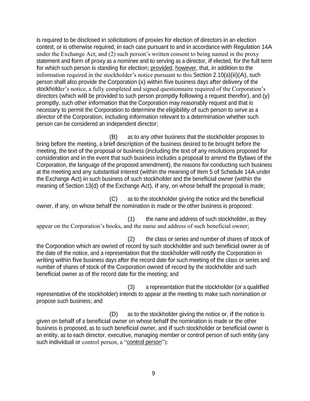 9 is required to be disclosed in solicitations of proxies for election of directors in an election contest, or is otherwise required, in each case pursuant to and in accordance with Regulation 14A under the Exchange Act; and (2) such person’s written consent to being named in the proxy statement and form of proxy as a nominee and to serving as a director, if elected, for the full term for which such person is standing for election; provided, however, that, in addition to the information required in the stockholder’s notice pursuant to this Section 2.10(a)(ii)(A), such person shall also provide the Corporation (x) within five business days after delivery of the stockholder’s notice, a fully completed and signed questionnaire required of the Corporation’s directors (which will be provided to such person promptly following a request therefor), and (y) promptly, such other information that the Corporation may reasonably request and that is necessary to permit the Corporation to determine the eligibility of such person to serve as a director of the Corporation, including information relevant to a determination whether such person can be considered an independent director; (B) as to any other business that the stockholder proposes to bring before the meeting, a brief description of the business desired to be brought before the meeting, the text of the proposal or business (including the text of any resolutions proposed for consideration and in the event that such business includes a proposal to amend the Bylaws of the Corporation, the language of the proposed amendment), the reasons for conducting such business at the meeting and any substantial interest (within the meaning of Item 5 of Schedule 14A under the Exchange Act) in such business of such stockholder and the beneficial owner (within the meaning of Section 13(d) of the Exchange Act), if any, on whose behalf the proposal is made; (C) as to the stockholder giving the notice and the beneficial owner, if any, on whose behalf the nomination is made or the other business is proposed: (1) the name and address of such stockholder, as they appear on the Corporation’s books, and the name and address of such beneficial owner; (2) the class or series and number of shares of stock of the Corporation which are owned of record by such stockholder and such beneficial owner as of the date of the notice, and a representation that the stockholder will notify the Corporation in writing within five business days after the record date for such meeting of the class or series and number of shares of stock of the Corporation owned of record by the stockholder and such beneficial owner as of the record date for the meeting; and (3) a representation that the stockholder (or a qualified representative of the stockholder) intends to appear at the meeting to make such nomination or propose such business; and (D) as to the stockholder giving the notice or, if the notice is given on behalf of a beneficial owner on whose behalf the nomination is made or the other business is proposed, as to such beneficial owner, and if such stockholder or beneficial owner is an entity, as to each director, executive, managing member or control person of such entity (any such individual or control person, a “control person”):