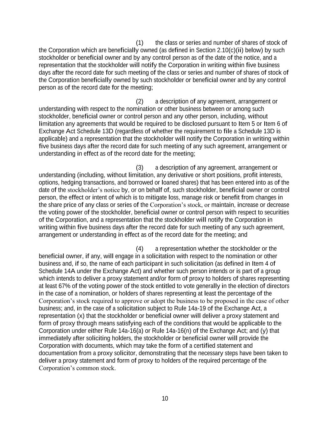 10 (1) the class or series and number of shares of stock of the Corporation which are beneficially owned (as defined in Section 2.10(c)(ii) below) by such stockholder or beneficial owner and by any control person as of the date of the notice, and a representation that the stockholder will notify the Corporation in writing within five business days after the record date for such meeting of the class or series and number of shares of stock of the Corporation beneficially owned by such stockholder or beneficial owner and by any control person as of the record date for the meeting; (2) a description of any agreement, arrangement or understanding with respect to the nomination or other business between or among such stockholder, beneficial owner or control person and any other person, including, without limitation any agreements that would be required to be disclosed pursuant to Item 5 or Item 6 of Exchange Act Schedule 13D (regardless of whether the requirement to file a Schedule 13D is applicable) and a representation that the stockholder will notify the Corporation in writing within five business days after the record date for such meeting of any such agreement, arrangement or understanding in effect as of the record date for the meeting; (3) a description of any agreement, arrangement or understanding (including, without limitation, any derivative or short positions, profit interests, options, hedging transactions, and borrowed or loaned shares) that has been entered into as of the date of the stockholder’s notice by, or on behalf of, such stockholder, beneficial owner or control person, the effect or intent of which is to mitigate loss, manage risk or benefit from changes in the share price of any class or series of the Corporation’s stock, or maintain, increase or decrease the voting power of the stockholder, beneficial owner or control person with respect to securities of the Corporation, and a representation that the stockholder will notify the Corporation in writing within five business days after the record date for such meeting of any such agreement, arrangement or understanding in effect as of the record date for the meeting; and (4) a representation whether the stockholder or the beneficial owner, if any, will engage in a solicitation with respect to the nomination or other business and, if so, the name of each participant in such solicitation (as defined in Item 4 of Schedule 14A under the Exchange Act) and whether such person intends or is part of a group which intends to deliver a proxy statement and/or form of proxy to holders of shares representing at least 67% of the voting power of the stock entitled to vote generally in the election of directors in the case of a nomination, or holders of shares representing at least the percentage of the Corporation’s stock required to approve or adopt the business to be proposed in the case of other business; and, in the case of a solicitation subject to Rule 14a-19 of the Exchange Act, a representation (x) that the stockholder or beneficial owner will deliver a proxy statement and form of proxy through means satisfying each of the conditions that would be applicable to the Corporation under either Rule 14a-16(a) or Rule 14a-16(n) of the Exchange Act; and (y) that immediately after soliciting holders, the stockholder or beneficial owner will provide the Corporation with documents, which may take the form of a certified statement and documentation from a proxy solicitor, demonstrating that the necessary steps have been taken to deliver a proxy statement and form of proxy to holders of the required percentage of the Corporation’s common stock.