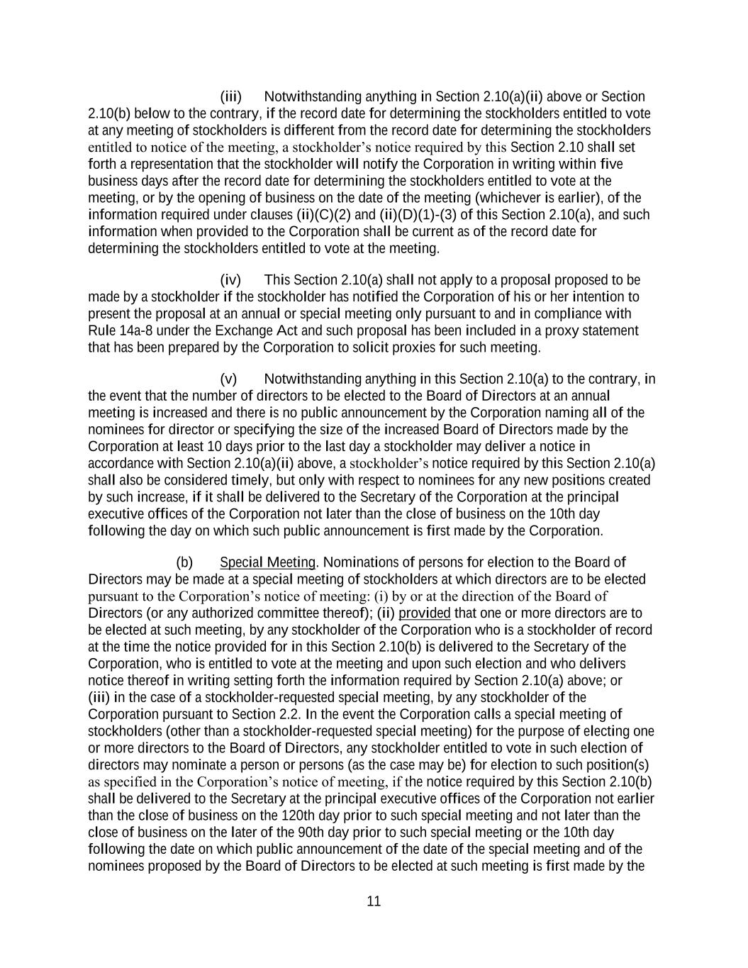 11 (iii) Notwithstanding anything in Section 2.10(a)(ii) above or Section 2.10(b) below to the contrary, if the record date for determining the stockholders entitled to vote at any meeting of stockholders is different from the record date for determining the stockholders entitled to notice of the meeting, a stockholder’s notice required by this Section 2.10 shall set forth a representation that the stockholder will notify the Corporation in writing within five business days after the record date for determining the stockholders entitled to vote at the meeting, or by the opening of business on the date of the meeting (whichever is earlier), of the information required under clauses (ii)(C)(2) and (ii)(D)(1)-(3) of this Section 2.10(a), and such information when provided to the Corporation shall be current as of the record date for determining the stockholders entitled to vote at the meeting. (iv) This Section 2.10(a) shall not apply to a proposal proposed to be made by a stockholder if the stockholder has notified the Corporation of his or her intention to present the proposal at an annual or special meeting only pursuant to and in compliance with Rule 14a-8 under the Exchange Act and such proposal has been included in a proxy statement that has been prepared by the Corporation to solicit proxies for such meeting. (v) Notwithstanding anything in this Section 2.10(a) to the contrary, in the event that the number of directors to be elected to the Board of Directors at an annual meeting is increased and there is no public announcement by the Corporation naming all of the nominees for director or specifying the size of the increased Board of Directors made by the Corporation at least 10 days prior to the last day a stockholder may deliver a notice in accordance with Section 2.10(a)(ii) above, a stockholder’s notice required by this Section 2.10(a) shall also be considered timely, but only with respect to nominees for any new positions created by such increase, if it shall be delivered to the Secretary of the Corporation at the principal executive offices of the Corporation not later than the close of business on the 10th day following the day on which such public announcement is first made by the Corporation. (b) Special Meeting. Nominations of persons for election to the Board of Directors may be made at a special meeting of stockholders at which directors are to be elected pursuant to the Corporation’s notice of meeting: (i) by or at the direction of the Board of Directors (or any authorized committee thereof); (ii) provided that one or more directors are to be elected at such meeting, by any stockholder of the Corporation who is a stockholder of record at the time the notice provided for in this Section 2.10(b) is delivered to the Secretary of the Corporation, who is entitled to vote at the meeting and upon such election and who delivers notice thereof in writing setting forth the information required by Section 2.10(a) above; or (iii) in the case of a stockholder-requested special meeting, by any stockholder of the Corporation pursuant to Section 2.2. In the event the Corporation calls a special meeting of stockholders (other than a stockholder-requested special meeting) for the purpose of electing one or more directors to the Board of Directors, any stockholder entitled to vote in such election of directors may nominate a person or persons (as the case may be) for election to such position(s) as specified in the Corporation’s notice of meeting, if the notice required by this Section 2.10(b) shall be delivered to the Secretary at the principal executive offices of the Corporation not earlier than the close of business on the 120th day prior to such special meeting and not later than the close of business on the later of the 90th day prior to such special meeting or the 10th day following the date on which public announcement of the date of the special meeting and of the nominees proposed by the Board of Directors to be elected at such meeting is first made by the