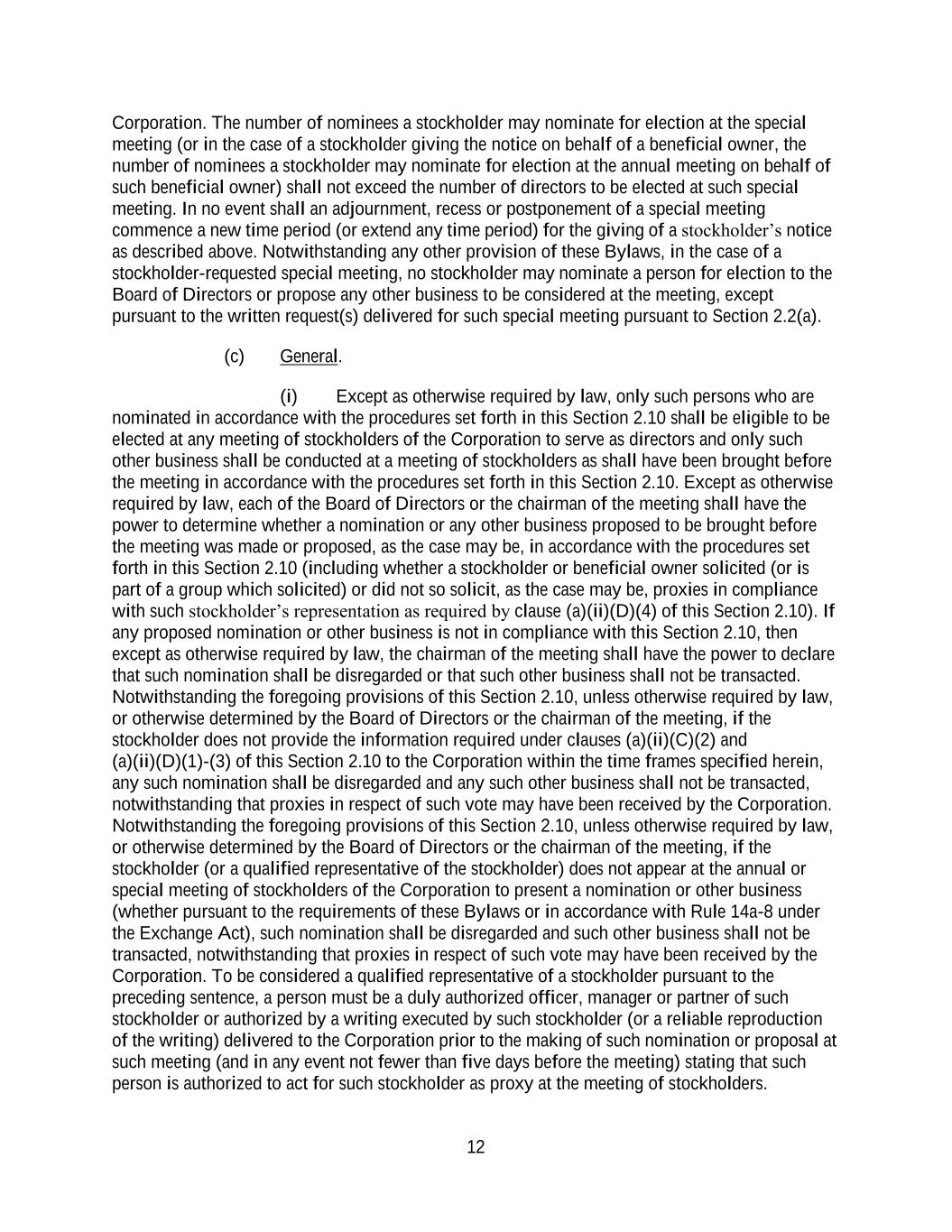 12 Corporation. The number of nominees a stockholder may nominate for election at the special meeting (or in the case of a stockholder giving the notice on behalf of a beneficial owner, the number of nominees a stockholder may nominate for election at the annual meeting on behalf of such beneficial owner) shall not exceed the number of directors to be elected at such special meeting. In no event shall an adjournment, recess or postponement of a special meeting commence a new time period (or extend any time period) for the giving of a stockholder’s notice as described above. Notwithstanding any other provision of these Bylaws, in the case of a stockholder-requested special meeting, no stockholder may nominate a person for election to the Board of Directors or propose any other business to be considered at the meeting, except pursuant to the written request(s) delivered for such special meeting pursuant to Section 2.2(a). (c) General. (i) Except as otherwise required by law, only such persons who are nominated in accordance with the procedures set forth in this Section 2.10 shall be eligible to be elected at any meeting of stockholders of the Corporation to serve as directors and only such other business shall be conducted at a meeting of stockholders as shall have been brought before the meeting in accordance with the procedures set forth in this Section 2.10. Except as otherwise required by law, each of the Board of Directors or the chairman of the meeting shall have the power to determine whether a nomination or any other business proposed to be brought before the meeting was made or proposed, as the case may be, in accordance with the procedures set forth in this Section 2.10 (including whether a stockholder or beneficial owner solicited (or is part of a group which solicited) or did not so solicit, as the case may be, proxies in compliance with such stockholder’s representation as required by clause (a)(ii)(D)(4) of this Section 2.10). If any proposed nomination or other business is not in compliance with this Section 2.10, then except as otherwise required by law, the chairman of the meeting shall have the power to declare that such nomination shall be disregarded or that such other business shall not be transacted. Notwithstanding the foregoing provisions of this Section 2.10, unless otherwise required by law, or otherwise determined by the Board of Directors or the chairman of the meeting, if the stockholder does not provide the information required under clauses (a)(ii)(C)(2) and (a)(ii)(D)(1)-(3) of this Section 2.10 to the Corporation within the time frames specified herein, any such nomination shall be disregarded and any such other business shall not be transacted, notwithstanding that proxies in respect of such vote may have been received by the Corporation. Notwithstanding the foregoing provisions of this Section 2.10, unless otherwise required by law, or otherwise determined by the Board of Directors or the chairman of the meeting, if the stockholder (or a qualified representative of the stockholder) does not appear at the annual or special meeting of stockholders of the Corporation to present a nomination or other business (whether pursuant to the requirements of these Bylaws or in accordance with Rule 14a-8 under the Exchange Act), such nomination shall be disregarded and such other business shall not be transacted, notwithstanding that proxies in respect of such vote may have been received by the Corporation. To be considered a qualified representative of a stockholder pursuant to the preceding sentence, a person must be a duly authorized officer, manager or partner of such stockholder or authorized by a writing executed by such stockholder (or a reliable reproduction of the writing) delivered to the Corporation prior to the making of such nomination or proposal at such meeting (and in any event not fewer than five days before the meeting) stating that such person is authorized to act for such stockholder as proxy at the meeting of stockholders.