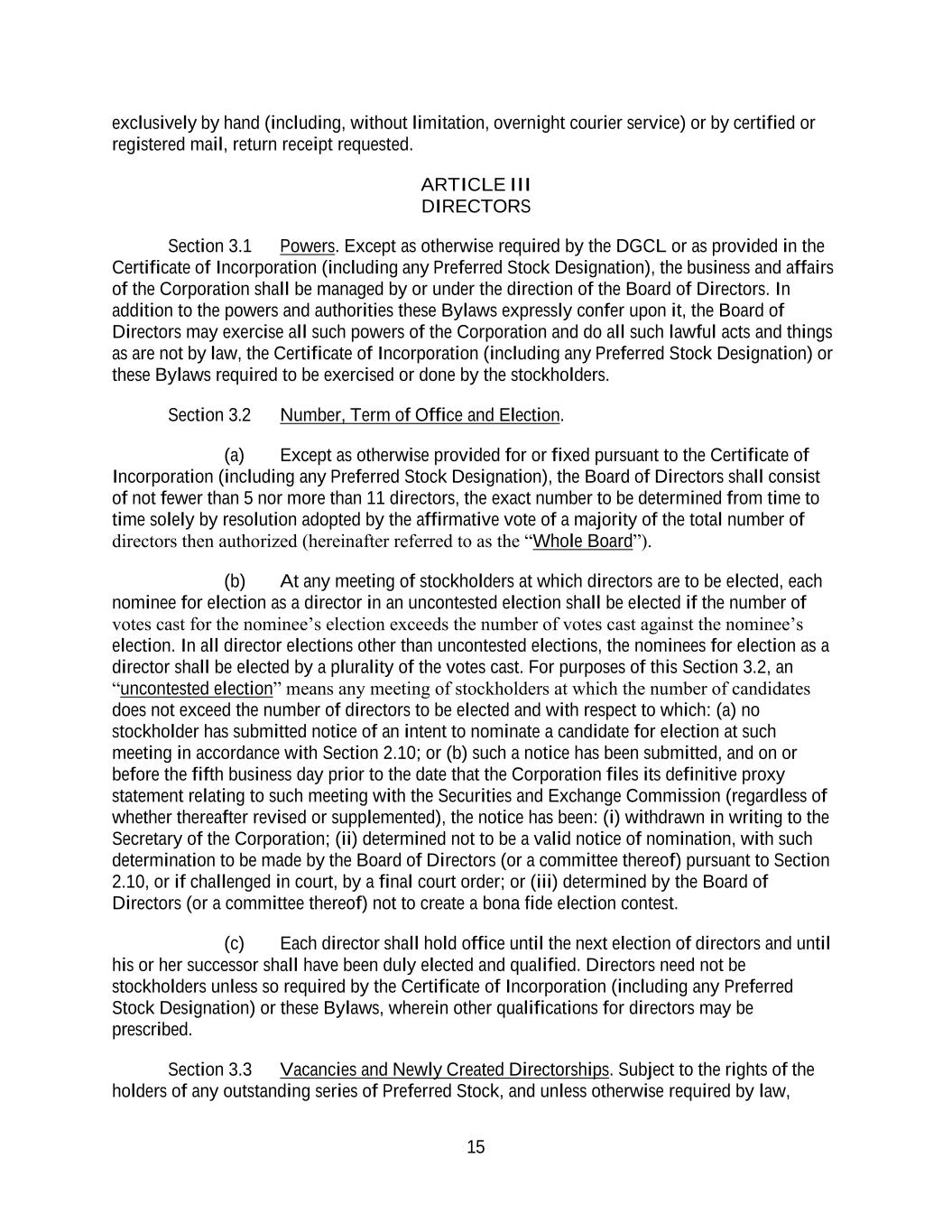 15 exclusively by hand (including, without limitation, overnight courier service) or by certified or registered mail, return receipt requested. ARTICLE III DIRECTORS Section 3.1 Powers. Except as otherwise required by the DGCL or as provided in the Certificate of Incorporation (including any Preferred Stock Designation), the business and affairs of the Corporation shall be managed by or under the direction of the Board of Directors. In addition to the powers and authorities these Bylaws expressly confer upon it, the Board of Directors may exercise all such powers of the Corporation and do all such lawful acts and things as are not by law, the Certificate of Incorporation (including any Preferred Stock Designation) or these Bylaws required to be exercised or done by the stockholders. Section 3.2 Number, Term of Office and Election. (a) Except as otherwise provided for or fixed pursuant to the Certificate of Incorporation (including any Preferred Stock Designation), the Board of Directors shall consist of not fewer than 5 nor more than 11 directors, the exact number to be determined from time to time solely by resolution adopted by the affirmative vote of a majority of the total number of directors then authorized (hereinafter referred to as the “Whole Board”). (b) At any meeting of stockholders at which directors are to be elected, each nominee for election as a director in an uncontested election shall be elected if the number of votes cast for the nominee’s election exceeds the number of votes cast against the nominee’s election. In all director elections other than uncontested elections, the nominees for election as a director shall be elected by a plurality of the votes cast. For purposes of this Section 3.2, an “uncontested election” means any meeting of stockholders at which the number of candidates does not exceed the number of directors to be elected and with respect to which: (a) no stockholder has submitted notice of an intent to nominate a candidate for election at such meeting in accordance with Section 2.10; or (b) such a notice has been submitted, and on or before the fifth business day prior to the date that the Corporation files its definitive proxy statement relating to such meeting with the Securities and Exchange Commission (regardless of whether thereafter revised or supplemented), the notice has been: (i) withdrawn in writing to the Secretary of the Corporation; (ii) determined not to be a valid notice of nomination, with such determination to be made by the Board of Directors (or a committee thereof) pursuant to Section 2.10, or if challenged in court, by a final court order; or (iii) determined by the Board of Directors (or a committee thereof) not to create a bona fide election contest. (c) Each director shall hold office until the next election of directors and until his or her successor shall have been duly elected and qualified. Directors need not be stockholders unless so required by the Certificate of Incorporation (including any Preferred Stock Designation) or these Bylaws, wherein other qualifications for directors may be prescribed. Section 3.3 Vacancies and Newly Created Directorships. Subject to the rights of the holders of any outstanding series of Preferred Stock, and unless otherwise required by law,