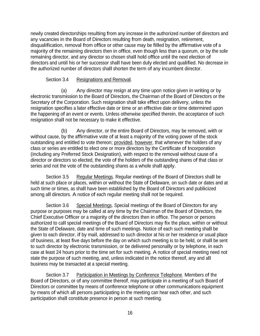 16 newly created directorships resulting from any increase in the authorized number of directors and any vacancies in the Board of Directors resulting from death, resignation, retirement, disqualification, removal from office or other cause may be filled by the affirmative vote of a majority of the remaining directors then in office, even though less than a quorum, or by the sole remaining director, and any director so chosen shall hold office until the next election of directors and until his or her successor shall have been duly elected and qualified. No decrease in the authorized number of directors shall shorten the term of any incumbent director. Section 3.4 Resignations and Removal. (a) Any director may resign at any time upon notice given in writing or by electronic transmission to the Board of Directors, the Chairman of the Board of Directors or the Secretary of the Corporation. Such resignation shall take effect upon delivery, unless the resignation specifies a later effective date or time or an effective date or time determined upon the happening of an event or events. Unless otherwise specified therein, the acceptance of such resignation shall not be necessary to make it effective. (b) Any director, or the entire Board of Directors, may be removed, with or without cause, by the affirmative vote of at least a majority of the voting power of the stock outstanding and entitled to vote thereon; provided, however, that whenever the holders of any class or series are entitled to elect one or more directors by the Certificate of Incorporation (including any Preferred Stock Designation), with respect to the removal without cause of a director or directors so elected, the vote of the holders of the outstanding shares of that class or series and not the vote of the outstanding shares as a whole shall apply. Section 3.5 Regular Meetings. Regular meetings of the Board of Directors shall be held at such place or places, within or without the State of Delaware, on such date or dates and at such time or times, as shall have been established by the Board of Directors and publicized among all directors. A notice of each regular meeting shall not be required. Section 3.6 Special Meetings. Special meetings of the Board of Directors for any purpose or purposes may be called at any time by the Chairman of the Board of Directors, the Chief Executive Officer or a majority of the directors then in office. The person or persons authorized to call special meetings of the Board of Directors may fix the place, within or without the State of Delaware, date and time of such meetings. Notice of each such meeting shall be given to each director, if by mail, addressed to such director at his or her residence or usual place of business, at least five days before the day on which such meeting is to be held, or shall be sent to such director by electronic transmission, or be delivered personally or by telephone, in each case at least 24 hours prior to the time set for such meeting. A notice of special meeting need not state the purpose of such meeting, and, unless indicated in the notice thereof, any and all business may be transacted at a special meeting. Section 3.7 Participation in Meetings by Conference Telephone. Members of the Board of Directors, or of any committee thereof, may participate in a meeting of such Board of Directors or committee by means of conference telephone or other communications equipment by means of which all persons participating in the meeting can hear each other, and such participation shall constitute presence in person at such meeting.