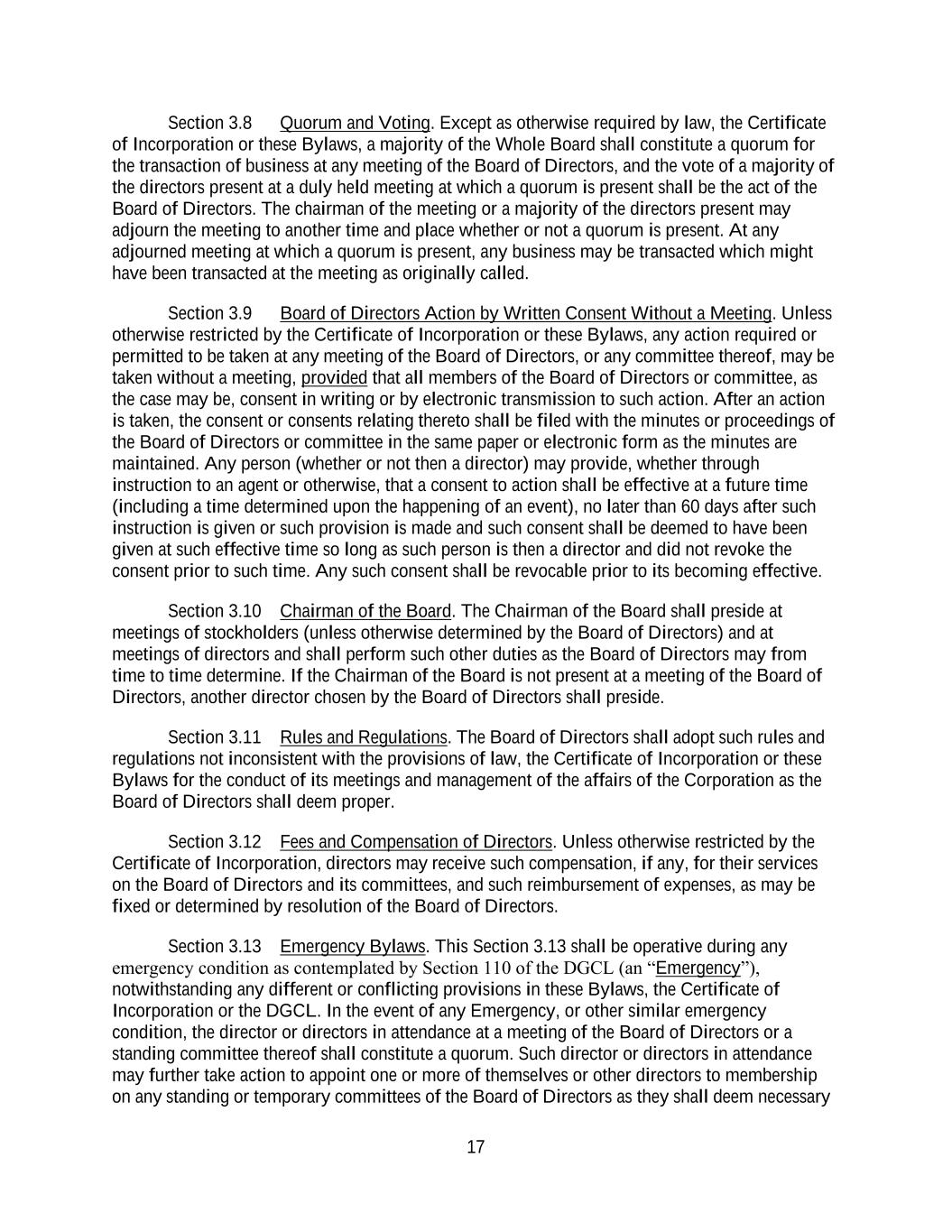 17 Section 3.8 Quorum and Voting. Except as otherwise required by law, the Certificate of Incorporation or these Bylaws, a majority of the Whole Board shall constitute a quorum for the transaction of business at any meeting of the Board of Directors, and the vote of a majority of the directors present at a duly held meeting at which a quorum is present shall be the act of the Board of Directors. The chairman of the meeting or a majority of the directors present may adjourn the meeting to another time and place whether or not a quorum is present. At any adjourned meeting at which a quorum is present, any business may be transacted which might have been transacted at the meeting as originally called. Section 3.9 Board of Directors Action by Written Consent Without a Meeting. Unless otherwise restricted by the Certificate of Incorporation or these Bylaws, any action required or permitted to be taken at any meeting of the Board of Directors, or any committee thereof, may be taken without a meeting, provided that all members of the Board of Directors or committee, as the case may be, consent in writing or by electronic transmission to such action. After an action is taken, the consent or consents relating thereto shall be filed with the minutes or proceedings of the Board of Directors or committee in the same paper or electronic form as the minutes are maintained. Any person (whether or not then a director) may provide, whether through instruction to an agent or otherwise, that a consent to action shall be effective at a future time (including a time determined upon the happening of an event), no later than 60 days after such instruction is given or such provision is made and such consent shall be deemed to have been given at such effective time so long as such person is then a director and did not revoke the consent prior to such time. Any such consent shall be revocable prior to its becoming effective. Section 3.10 Chairman of the Board. The Chairman of the Board shall preside at meetings of stockholders (unless otherwise determined by the Board of Directors) and at meetings of directors and shall perform such other duties as the Board of Directors may from time to time determine. If the Chairman of the Board is not present at a meeting of the Board of Directors, another director chosen by the Board of Directors shall preside. Section 3.11 Rules and Regulations. The Board of Directors shall adopt such rules and regulations not inconsistent with the provisions of law, the Certificate of Incorporation or these Bylaws for the conduct of its meetings and management of the affairs of the Corporation as the Board of Directors shall deem proper. Section 3.12 Fees and Compensation of Directors. Unless otherwise restricted by the Certificate of Incorporation, directors may receive such compensation, if any, for their services on the Board of Directors and its committees, and such reimbursement of expenses, as may be fixed or determined by resolution of the Board of Directors. Section 3.13 Emergency Bylaws. This Section 3.13 shall be operative during any emergency condition as contemplated by Section 110 of the DGCL (an “Emergency”), notwithstanding any different or conflicting provisions in these Bylaws, the Certificate of Incorporation or the DGCL. In the event of any Emergency, or other similar emergency condition, the director or directors in attendance at a meeting of the Board of Directors or a standing committee thereof shall constitute a quorum. Such director or directors in attendance may further take action to appoint one or more of themselves or other directors to membership on any standing or temporary committees of the Board of Directors as they shall deem necessary