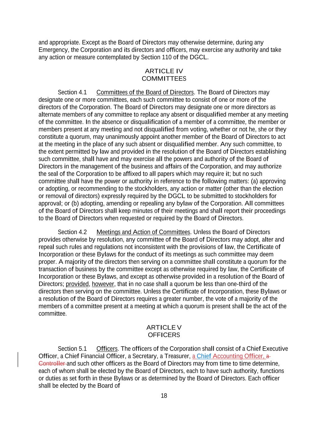 18 and appropriate. Except as the Board of Directors may otherwise determine, during any Emergency, the Corporation and its directors and officers, may exercise any authority and take any action or measure contemplated by Section 110 of the DGCL. ARTICLE IV COMMITTEES Section 4.1 Committees of the Board of Directors. The Board of Directors may designate one or more committees, each such committee to consist of one or more of the directors of the Corporation. The Board of Directors may designate one or more directors as alternate members of any committee to replace any absent or disqualified member at any meeting of the committee. In the absence or disqualification of a member of a committee, the member or members present at any meeting and not disqualified from voting, whether or not he, she or they constitute a quorum, may unanimously appoint another member of the Board of Directors to act at the meeting in the place of any such absent or disqualified member. Any such committee, to the extent permitted by law and provided in the resolution of the Board of Directors establishing such committee, shall have and may exercise all the powers and authority of the Board of Directors in the management of the business and affairs of the Corporation, and may authorize the seal of the Corporation to be affixed to all papers which may require it; but no such committee shall have the power or authority in reference to the following matters: (a) approving or adopting, or recommending to the stockholders, any action or matter (other than the election or removal of directors) expressly required by the DGCL to be submitted to stockholders for approval; or (b) adopting, amending or repealing any bylaw of the Corporation. All committees of the Board of Directors shall keep minutes of their meetings and shall report their proceedings to the Board of Directors when requested or required by the Board of Directors. Section 4.2 Meetings and Action of Committees. Unless the Board of Directors provides otherwise by resolution, any committee of the Board of Directors may adopt, alter and repeal such rules and regulations not inconsistent with the provisions of law, the Certificate of Incorporation or these Bylaws for the conduct of its meetings as such committee may deem proper. A majority of the directors then serving on a committee shall constitute a quorum for the transaction of business by the committee except as otherwise required by law, the Certificate of Incorporation or these Bylaws, and except as otherwise provided in a resolution of the Board of Directors; provided, however, that in no case shall a quorum be less than one-third of the directors then serving on the committee. Unless the Certificate of Incorporation, these Bylaws or a resolution of the Board of Directors requires a greater number, the vote of a majority of the members of a committee present at a meeting at which a quorum is present shall be the act of the committee. ARTICLE V OFFICERS Section 5.1 Officers. The officers of the Corporation shall consist of a Chief Executive Officer, a Chief Financial Officer, a Secretary, a Treasurer, a Chief Accounting Officer, a Controller and such other officers as the Board of Directors may from time to time determine, each of whom shall be elected by the Board of Directors, each to have such authority, functions or duties as set forth in these Bylaws or as determined by the Board of Directors. Each officer shall be elected by the Board of