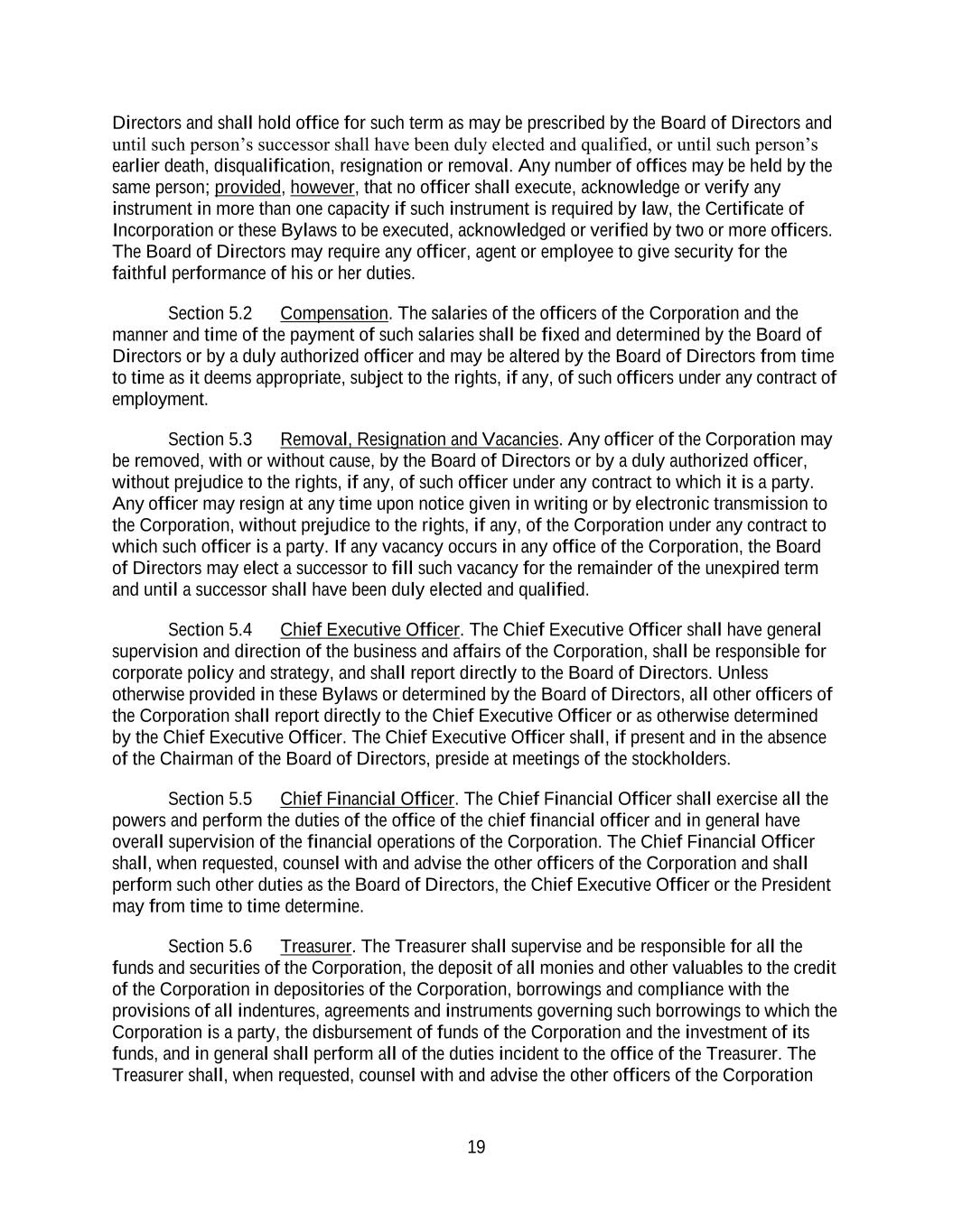 19 Directors and shall hold office for such term as may be prescribed by the Board of Directors and until such person’s successor shall have been duly elected and qualified, or until such person’s earlier death, disqualification, resignation or removal. Any number of offices may be held by the same person; provided, however, that no officer shall execute, acknowledge or verify any instrument in more than one capacity if such instrument is required by law, the Certificate of Incorporation or these Bylaws to be executed, acknowledged or verified by two or more officers. The Board of Directors may require any officer, agent or employee to give security for the faithful performance of his or her duties. Section 5.2 Compensation. The salaries of the officers of the Corporation and the manner and time of the payment of such salaries shall be fixed and determined by the Board of Directors or by a duly authorized officer and may be altered by the Board of Directors from time to time as it deems appropriate, subject to the rights, if any, of such officers under any contract of employment. Section 5.3 Removal, Resignation and Vacancies. Any officer of the Corporation may be removed, with or without cause, by the Board of Directors or by a duly authorized officer, without prejudice to the rights, if any, of such officer under any contract to which it is a party. Any officer may resign at any time upon notice given in writing or by electronic transmission to the Corporation, without prejudice to the rights, if any, of the Corporation under any contract to which such officer is a party. If any vacancy occurs in any office of the Corporation, the Board of Directors may elect a successor to fill such vacancy for the remainder of the unexpired term and until a successor shall have been duly elected and qualified. Section 5.4 Chief Executive Officer. The Chief Executive Officer shall have general supervision and direction of the business and affairs of the Corporation, shall be responsible for corporate policy and strategy, and shall report directly to the Board of Directors. Unless otherwise provided in these Bylaws or determined by the Board of Directors, all other officers of the Corporation shall report directly to the Chief Executive Officer or as otherwise determined by the Chief Executive Officer. The Chief Executive Officer shall, if present and in the absence of the Chairman of the Board of Directors, preside at meetings of the stockholders. Section 5.5 Chief Financial Officer. The Chief Financial Officer shall exercise all the powers and perform the duties of the office of the chief financial officer and in general have overall supervision of the financial operations of the Corporation. The Chief Financial Officer shall, when requested, counsel with and advise the other officers of the Corporation and shall perform such other duties as the Board of Directors, the Chief Executive Officer or the President may from time to time determine. Section 5.6 Treasurer. The Treasurer shall supervise and be responsible for all the funds and securities of the Corporation, the deposit of all monies and other valuables to the credit of the Corporation in depositories of the Corporation, borrowings and compliance with the provisions of all indentures, agreements and instruments governing such borrowings to which the Corporation is a party, the disbursement of funds of the Corporation and the investment of its funds, and in general shall perform all of the duties incident to the office of the Treasurer. The Treasurer shall, when requested, counsel with and advise the other officers of the Corporation