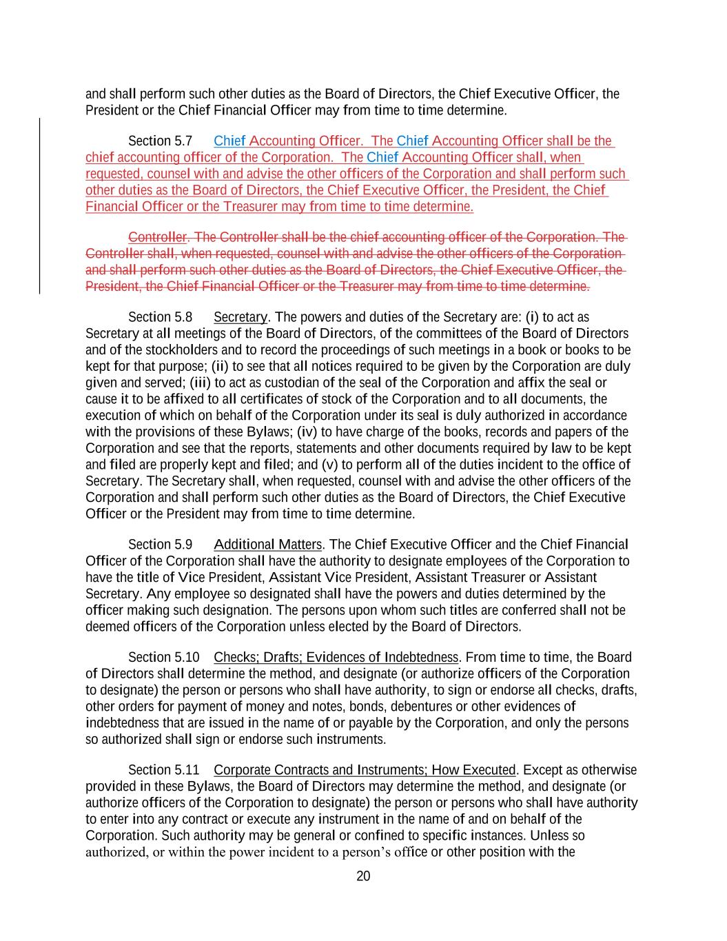 20 and shall perform such other duties as the Board of Directors, the Chief Executive Officer, the President or the Chief Financial Officer may from time to time determine. Section 5.7 Chief Accounting Officer. The Chief Accounting Officer shall be the chief accounting officer of the Corporation. The Chief Accounting Officer shall, when requested, counsel with and advise the other officers of the Corporation and shall perform such other duties as the Board of Directors, the Chief Executive Officer, the President, the Chief Financial Officer or the Treasurer may from time to time determine. Controller. The Controller shall be the chief accounting officer of the Corporation. The Controller shall, when requested, counsel with and advise the other officers of the Corporation and shall perform such other duties as the Board of Directors, the Chief Executive Officer, the President, the Chief Financial Officer or the Treasurer may from time to time determine. Section 5.8 Secretary. The powers and duties of the Secretary are: (i) to act as Secretary at all meetings of the Board of Directors, of the committees of the Board of Directors and of the stockholders and to record the proceedings of such meetings in a book or books to be kept for that purpose; (ii) to see that all notices required to be given by the Corporation are duly given and served; (iii) to act as custodian of the seal of the Corporation and affix the seal or cause it to be affixed to all certificates of stock of the Corporation and to all documents, the execution of which on behalf of the Corporation under its seal is duly authorized in accordance with the provisions of these Bylaws; (iv) to have charge of the books, records and papers of the Corporation and see that the reports, statements and other documents required by law to be kept and filed are properly kept and filed; and (v) to perform all of the duties incident to the office of Secretary. The Secretary shall, when requested, counsel with and advise the other officers of the Corporation and shall perform such other duties as the Board of Directors, the Chief Executive Officer or the President may from time to time determine. Section 5.9 Additional Matters. The Chief Executive Officer and the Chief Financial Officer of the Corporation shall have the authority to designate employees of the Corporation to have the title of Vice President, Assistant Vice President, Assistant Treasurer or Assistant Secretary. Any employee so designated shall have the powers and duties determined by the officer making such designation. The persons upon whom such titles are conferred shall not be deemed officers of the Corporation unless elected by the Board of Directors. Section 5.10 Checks; Drafts; Evidences of Indebtedness. From time to time, the Board of Directors shall determine the method, and designate (or authorize officers of the Corporation to designate) the person or persons who shall have authority, to sign or endorse all checks, drafts, other orders for payment of money and notes, bonds, debentures or other evidences of indebtedness that are issued in the name of or payable by the Corporation, and only the persons so authorized shall sign or endorse such instruments. Section 5.11 Corporate Contracts and Instruments; How Executed. Except as otherwise provided in these Bylaws, the Board of Directors may determine the method, and designate (or authorize officers of the Corporation to designate) the person or persons who shall have authority to enter into any contract or execute any instrument in the name of and on behalf of the Corporation. Such authority may be general or confined to specific instances. Unless so authorized, or within the power incident to a person’s office or other position with the