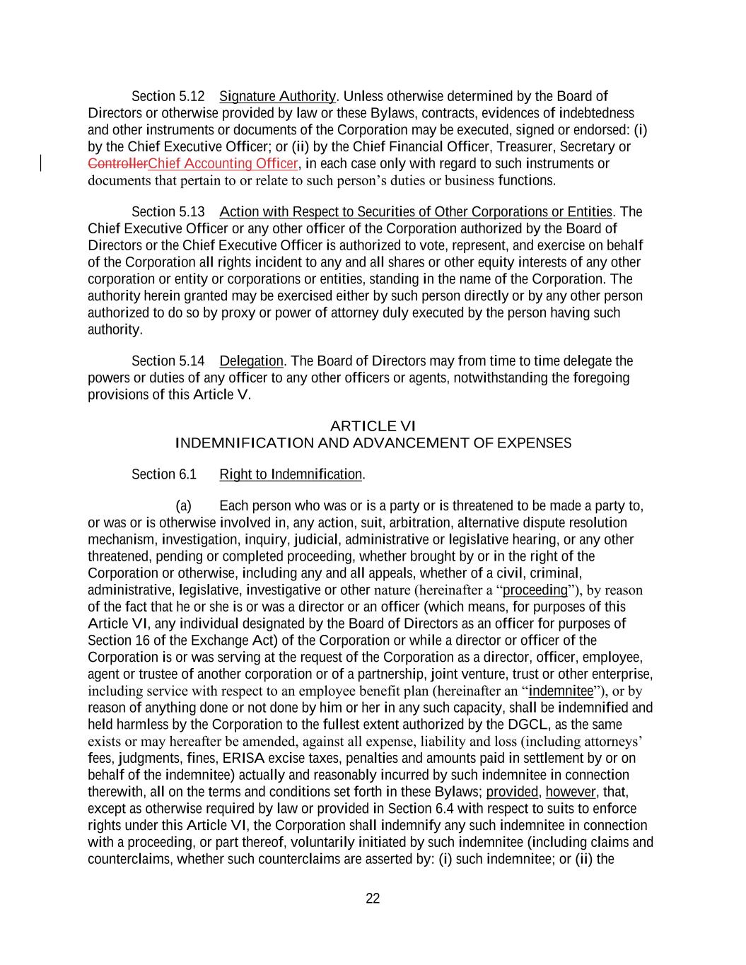 22 Section 5.12 Signature Authority. Unless otherwise determined by the Board of Directors or otherwise provided by law or these Bylaws, contracts, evidences of indebtedness and other instruments or documents of the Corporation may be executed, signed or endorsed: (i) by the Chief Executive Officer; or (ii) by the Chief Financial Officer, Treasurer, Secretary or ControllerChief Accounting Officer, in each case only with regard to such instruments or documents that pertain to or relate to such person’s duties or business functions. Section 5.13 Action with Respect to Securities of Other Corporations or Entities. The Chief Executive Officer or any other officer of the Corporation authorized by the Board of Directors or the Chief Executive Officer is authorized to vote, represent, and exercise on behalf of the Corporation all rights incident to any and all shares or other equity interests of any other corporation or entity or corporations or entities, standing in the name of the Corporation. The authority herein granted may be exercised either by such person directly or by any other person authorized to do so by proxy or power of attorney duly executed by the person having such authority. Section 5.14 Delegation. The Board of Directors may from time to time delegate the powers or duties of any officer to any other officers or agents, notwithstanding the foregoing provisions of this Article V. ARTICLE VI INDEMNIFICATION AND ADVANCEMENT OF EXPENSES Section 6.1 Right to Indemnification. (a) Each person who was or is a party or is threatened to be made a party to, or was or is otherwise involved in, any action, suit, arbitration, alternative dispute resolution mechanism, investigation, inquiry, judicial, administrative or legislative hearing, or any other threatened, pending or completed proceeding, whether brought by or in the right of the Corporation or otherwise, including any and all appeals, whether of a civil, criminal, administrative, legislative, investigative or other nature (hereinafter a “proceeding”), by reason of the fact that he or she is or was a director or an officer (which means, for purposes of this Article VI, any individual designated by the Board of Directors as an officer for purposes of Section 16 of the Exchange Act) of the Corporation or while a director or officer of the Corporation is or was serving at the request of the Corporation as a director, officer, employee, agent or trustee of another corporation or of a partnership, joint venture, trust or other enterprise, including service with respect to an employee benefit plan (hereinafter an “indemnitee”), or by reason of anything done or not done by him or her in any such capacity, shall be indemnified and held harmless by the Corporation to the fullest extent authorized by the DGCL, as the same exists or may hereafter be amended, against all expense, liability and loss (including attorneys’ fees, judgments, fines, ERISA excise taxes, penalties and amounts paid in settlement by or on behalf of the indemnitee) actually and reasonably incurred by such indemnitee in connection therewith, all on the terms and conditions set forth in these Bylaws; provided, however, that, except as otherwise required by law or provided in Section 6.4 with respect to suits to enforce rights under this Article VI, the Corporation shall indemnify any such indemnitee in connection with a proceeding, or part thereof, voluntarily initiated by such indemnitee (including claims and counterclaims, whether such counterclaims are asserted by: (i) such indemnitee; or (ii) the