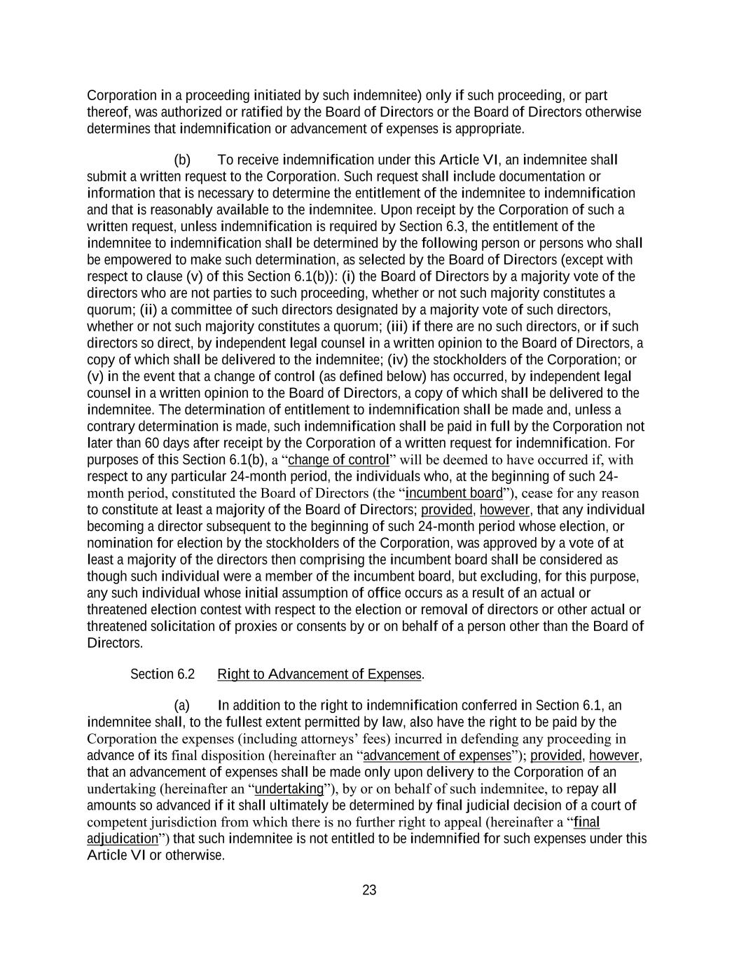 23 Corporation in a proceeding initiated by such indemnitee) only if such proceeding, or part thereof, was authorized or ratified by the Board of Directors or the Board of Directors otherwise determines that indemnification or advancement of expenses is appropriate. (b) To receive indemnification under this Article VI, an indemnitee shall submit a written request to the Corporation. Such request shall include documentation or information that is necessary to determine the entitlement of the indemnitee to indemnification and that is reasonably available to the indemnitee. Upon receipt by the Corporation of such a written request, unless indemnification is required by Section 6.3, the entitlement of the indemnitee to indemnification shall be determined by the following person or persons who shall be empowered to make such determination, as selected by the Board of Directors (except with respect to clause (v) of this Section 6.1(b)): (i) the Board of Directors by a majority vote of the directors who are not parties to such proceeding, whether or not such majority constitutes a quorum; (ii) a committee of such directors designated by a majority vote of such directors, whether or not such majority constitutes a quorum; (iii) if there are no such directors, or if such directors so direct, by independent legal counsel in a written opinion to the Board of Directors, a copy of which shall be delivered to the indemnitee; (iv) the stockholders of the Corporation; or (v) in the event that a change of control (as defined below) has occurred, by independent legal counsel in a written opinion to the Board of Directors, a copy of which shall be delivered to the indemnitee. The determination of entitlement to indemnification shall be made and, unless a contrary determination is made, such indemnification shall be paid in full by the Corporation not later than 60 days after receipt by the Corporation of a written request for indemnification. For purposes of this Section 6.1(b), a “change of control” will be deemed to have occurred if, with respect to any particular 24-month period, the individuals who, at the beginning of such 24- month period, constituted the Board of Directors (the “incumbent board”), cease for any reason to constitute at least a majority of the Board of Directors; provided, however, that any individual becoming a director subsequent to the beginning of such 24-month period whose election, or nomination for election by the stockholders of the Corporation, was approved by a vote of at least a majority of the directors then comprising the incumbent board shall be considered as though such individual were a member of the incumbent board, but excluding, for this purpose, any such individual whose initial assumption of office occurs as a result of an actual or threatened election contest with respect to the election or removal of directors or other actual or threatened solicitation of proxies or consents by or on behalf of a person other than the Board of Directors. Section 6.2 Right to Advancement of Expenses. (a) In addition to the right to indemnification conferred in Section 6.1, an indemnitee shall, to the fullest extent permitted by law, also have the right to be paid by the Corporation the expenses (including attorneys’ fees) incurred in defending any proceeding in advance of its final disposition (hereinafter an “advancement of expenses”); provided, however, that an advancement of expenses shall be made only upon delivery to the Corporation of an undertaking (hereinafter an “undertaking”), by or on behalf of such indemnitee, to repay all amounts so advanced if it shall ultimately be determined by final judicial decision of a court of competent jurisdiction from which there is no further right to appeal (hereinafter a “final adjudication”) that such indemnitee is not entitled to be indemnified for such expenses under this Article VI or otherwise.