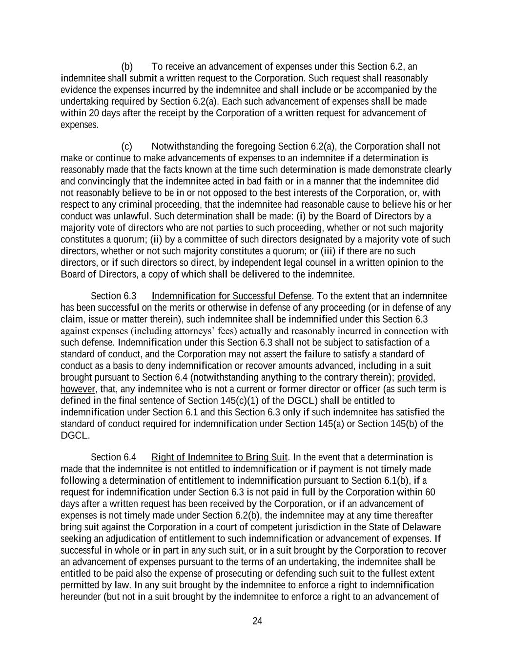 24 (b) To receive an advancement of expenses under this Section 6.2, an indemnitee shall submit a written request to the Corporation. Such request shall reasonably evidence the expenses incurred by the indemnitee and shall include or be accompanied by the undertaking required by Section 6.2(a). Each such advancement of expenses shall be made within 20 days after the receipt by the Corporation of a written request for advancement of expenses. (c) Notwithstanding the foregoing Section 6.2(a), the Corporation shall not make or continue to make advancements of expenses to an indemnitee if a determination is reasonably made that the facts known at the time such determination is made demonstrate clearly and convincingly that the indemnitee acted in bad faith or in a manner that the indemnitee did not reasonably believe to be in or not opposed to the best interests of the Corporation, or, with respect to any criminal proceeding, that the indemnitee had reasonable cause to believe his or her conduct was unlawful. Such determination shall be made: (i) by the Board of Directors by a majority vote of directors who are not parties to such proceeding, whether or not such majority constitutes a quorum; (ii) by a committee of such directors designated by a majority vote of such directors, whether or not such majority constitutes a quorum; or (iii) if there are no such directors, or if such directors so direct, by independent legal counsel in a written opinion to the Board of Directors, a copy of which shall be delivered to the indemnitee. Section 6.3 Indemnification for Successful Defense. To the extent that an indemnitee has been successful on the merits or otherwise in defense of any proceeding (or in defense of any claim, issue or matter therein), such indemnitee shall be indemnified under this Section 6.3 against expenses (including attorneys’ fees) actually and reasonably incurred in connection with such defense. Indemnification under this Section 6.3 shall not be subject to satisfaction of a standard of conduct, and the Corporation may not assert the failure to satisfy a standard of conduct as a basis to deny indemnification or recover amounts advanced, including in a suit brought pursuant to Section 6.4 (notwithstanding anything to the contrary therein); provided, however, that, any indemnitee who is not a current or former director or officer (as such term is defined in the final sentence of Section 145(c)(1) of the DGCL) shall be entitled to indemnification under Section 6.1 and this Section 6.3 only if such indemnitee has satisfied the standard of conduct required for indemnification under Section 145(a) or Section 145(b) of the DGCL. Section 6.4 Right of Indemnitee to Bring Suit. In the event that a determination is made that the indemnitee is not entitled to indemnification or if payment is not timely made following a determination of entitlement to indemnification pursuant to Section 6.1(b), if a request for indemnification under Section 6.3 is not paid in full by the Corporation within 60 days after a written request has been received by the Corporation, or if an advancement of expenses is not timely made under Section 6.2(b), the indemnitee may at any time thereafter bring suit against the Corporation in a court of competent jurisdiction in the State of Delaware seeking an adjudication of entitlement to such indemnification or advancement of expenses. If successful in whole or in part in any such suit, or in a suit brought by the Corporation to recover an advancement of expenses pursuant to the terms of an undertaking, the indemnitee shall be entitled to be paid also the expense of prosecuting or defending such suit to the fullest extent permitted by law. In any suit brought by the indemnitee to enforce a right to indemnification hereunder (but not in a suit brought by the indemnitee to enforce a right to an advancement of
