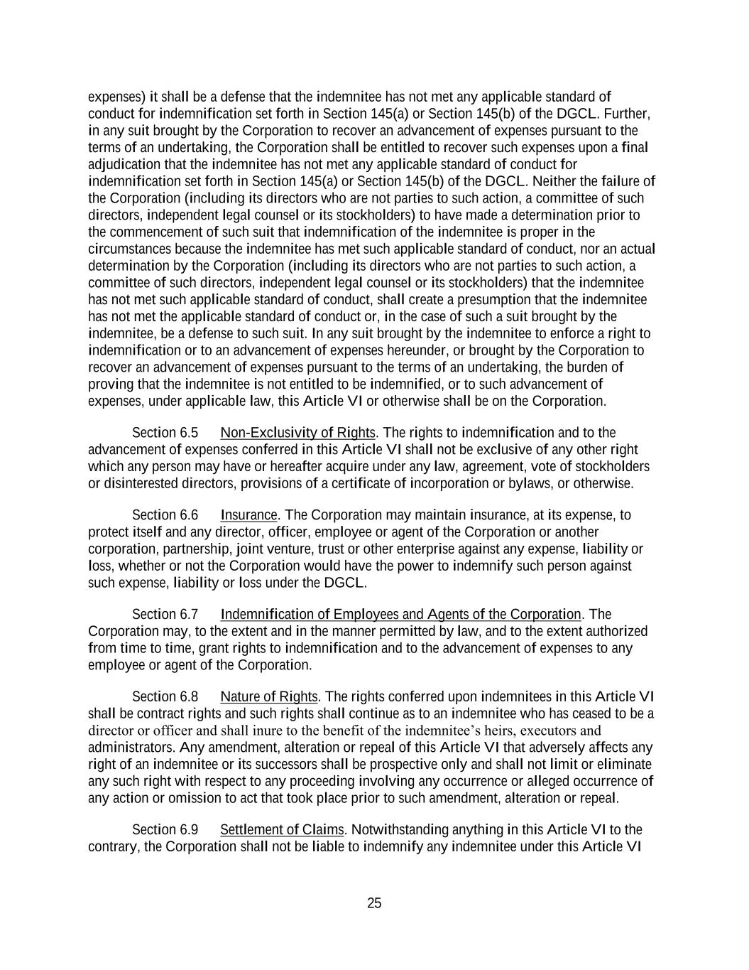 25 expenses) it shall be a defense that the indemnitee has not met any applicable standard of conduct for indemnification set forth in Section 145(a) or Section 145(b) of the DGCL. Further, in any suit brought by the Corporation to recover an advancement of expenses pursuant to the terms of an undertaking, the Corporation shall be entitled to recover such expenses upon a final adjudication that the indemnitee has not met any applicable standard of conduct for indemnification set forth in Section 145(a) or Section 145(b) of the DGCL. Neither the failure of the Corporation (including its directors who are not parties to such action, a committee of such directors, independent legal counsel or its stockholders) to have made a determination prior to the commencement of such suit that indemnification of the indemnitee is proper in the circumstances because the indemnitee has met such applicable standard of conduct, nor an actual determination by the Corporation (including its directors who are not parties to such action, a committee of such directors, independent legal counsel or its stockholders) that the indemnitee has not met such applicable standard of conduct, shall create a presumption that the indemnitee has not met the applicable standard of conduct or, in the case of such a suit brought by the indemnitee, be a defense to such suit. In any suit brought by the indemnitee to enforce a right to indemnification or to an advancement of expenses hereunder, or brought by the Corporation to recover an advancement of expenses pursuant to the terms of an undertaking, the burden of proving that the indemnitee is not entitled to be indemnified, or to such advancement of expenses, under applicable law, this Article VI or otherwise shall be on the Corporation. Section 6.5 Non-Exclusivity of Rights. The rights to indemnification and to the advancement of expenses conferred in this Article VI shall not be exclusive of any other right which any person may have or hereafter acquire under any law, agreement, vote of stockholders or disinterested directors, provisions of a certificate of incorporation or bylaws, or otherwise. Section 6.6 Insurance. The Corporation may maintain insurance, at its expense, to protect itself and any director, officer, employee or agent of the Corporation or another corporation, partnership, joint venture, trust or other enterprise against any expense, liability or loss, whether or not the Corporation would have the power to indemnify such person against such expense, liability or loss under the DGCL. Section 6.7 Indemnification of Employees and Agents of the Corporation. The Corporation may, to the extent and in the manner permitted by law, and to the extent authorized from time to time, grant rights to indemnification and to the advancement of expenses to any employee or agent of the Corporation. Section 6.8 Nature of Rights. The rights conferred upon indemnitees in this Article VI shall be contract rights and such rights shall continue as to an indemnitee who has ceased to be a director or officer and shall inure to the benefit of the indemnitee’s heirs, executors and administrators. Any amendment, alteration or repeal of this Article VI that adversely affects any right of an indemnitee or its successors shall be prospective only and shall not limit or eliminate any such right with respect to any proceeding involving any occurrence or alleged occurrence of any action or omission to act that took place prior to such amendment, alteration or repeal. Section 6.9 Settlement of Claims. Notwithstanding anything in this Article VI to the contrary, the Corporation shall not be liable to indemnify any indemnitee under this Article VI