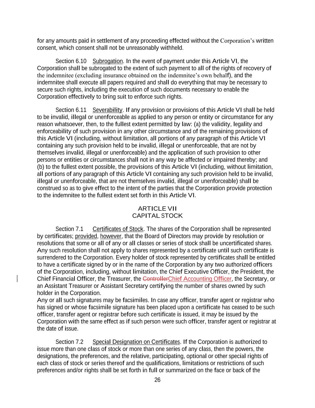26 for any amounts paid in settlement of any proceeding effected without the Corporation’s written consent, which consent shall not be unreasonably withheld. Section 6.10 Subrogation. In the event of payment under this Article VI, the Corporation shall be subrogated to the extent of such payment to all of the rights of recovery of the indemnitee (excluding insurance obtained on the indemnitee’s own behalf), and the indemnitee shall execute all papers required and shall do everything that may be necessary to secure such rights, including the execution of such documents necessary to enable the Corporation effectively to bring suit to enforce such rights. Section 6.11 Severability. If any provision or provisions of this Article VI shall be held to be invalid, illegal or unenforceable as applied to any person or entity or circumstance for any reason whatsoever, then, to the fullest extent permitted by law: (a) the validity, legality and enforceability of such provision in any other circumstance and of the remaining provisions of this Article VI (including, without limitation, all portions of any paragraph of this Article VI containing any such provision held to be invalid, illegal or unenforceable, that are not by themselves invalid, illegal or unenforceable) and the application of such provision to other persons or entities or circumstances shall not in any way be affected or impaired thereby; and (b) to the fullest extent possible, the provisions of this Article VI (including, without limitation, all portions of any paragraph of this Article VI containing any such provision held to be invalid, illegal or unenforceable, that are not themselves invalid, illegal or unenforceable) shall be construed so as to give effect to the intent of the parties that the Corporation provide protection to the indemnitee to the fullest extent set forth in this Article VI. ARTICLE VII CAPITAL STOCK Section 7.1 Certificates of Stock. The shares of the Corporation shall be represented by certificates; provided, however, that the Board of Directors may provide by resolution or resolutions that some or all of any or all classes or series of stock shall be uncertificated shares. Any such resolution shall not apply to shares represented by a certificate until such certificate is surrendered to the Corporation. Every holder of stock represented by certificates shall be entitled to have a certificate signed by or in the name of the Corporation by any two authorized officers of the Corporation, including, without limitation, the Chief Executive Officer, the President, the Chief Financial Officer, the Treasurer, the ControllerChief Accounting Officer, the Secretary, or an Assistant Treasurer or Assistant Secretary certifying the number of shares owned by such holder in the Corporation. Any or all such signatures may be facsimiles. In case any officer, transfer agent or registrar who has signed or whose facsimile signature has been placed upon a certificate has ceased to be such officer, transfer agent or registrar before such certificate is issued, it may be issued by the Corporation with the same effect as if such person were such officer, transfer agent or registrar at the date of issue. Section 7.2 Special Designation on Certificates. If the Corporation is authorized to issue more than one class of stock or more than one series of any class, then the powers, the designations, the preferences, and the relative, participating, optional or other special rights of each class of stock or series thereof and the qualifications, limitations or restrictions of such preferences and/or rights shall be set forth in full or summarized on the face or back of the