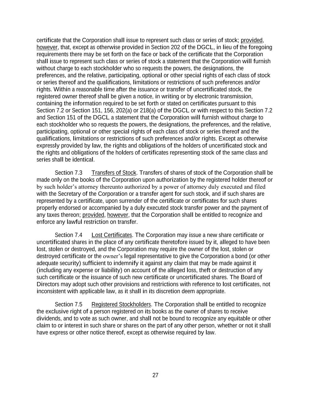 27 certificate that the Corporation shall issue to represent such class or series of stock; provided, however, that, except as otherwise provided in Section 202 of the DGCL, in lieu of the foregoing requirements there may be set forth on the face or back of the certificate that the Corporation shall issue to represent such class or series of stock a statement that the Corporation will furnish without charge to each stockholder who so requests the powers, the designations, the preferences, and the relative, participating, optional or other special rights of each class of stock or series thereof and the qualifications, limitations or restrictions of such preferences and/or rights. Within a reasonable time after the issuance or transfer of uncertificated stock, the registered owner thereof shall be given a notice, in writing or by electronic transmission, containing the information required to be set forth or stated on certificates pursuant to this Section 7.2 or Section 151, 156, 202(a) or 218(a) of the DGCL or with respect to this Section 7.2 and Section 151 of the DGCL a statement that the Corporation will furnish without charge to each stockholder who so requests the powers, the designations, the preferences, and the relative, participating, optional or other special rights of each class of stock or series thereof and the qualifications, limitations or restrictions of such preferences and/or rights. Except as otherwise expressly provided by law, the rights and obligations of the holders of uncertificated stock and the rights and obligations of the holders of certificates representing stock of the same class and series shall be identical. Section 7.3 Transfers of Stock. Transfers of shares of stock of the Corporation shall be made only on the books of the Corporation upon authorization by the registered holder thereof or by such holder’s attorney thereunto authorized by a power of attorney duly executed and filed with the Secretary of the Corporation or a transfer agent for such stock, and if such shares are represented by a certificate, upon surrender of the certificate or certificates for such shares properly endorsed or accompanied by a duly executed stock transfer power and the payment of any taxes thereon; provided, however, that the Corporation shall be entitled to recognize and enforce any lawful restriction on transfer. Section 7.4 Lost Certificates. The Corporation may issue a new share certificate or uncertificated shares in the place of any certificate theretofore issued by it, alleged to have been lost, stolen or destroyed, and the Corporation may require the owner of the lost, stolen or destroyed certificate or the owner’s legal representative to give the Corporation a bond (or other adequate security) sufficient to indemnify it against any claim that may be made against it (including any expense or liability) on account of the alleged loss, theft or destruction of any such certificate or the issuance of such new certificate or uncertificated shares. The Board of Directors may adopt such other provisions and restrictions with reference to lost certificates, not inconsistent with applicable law, as it shall in its discretion deem appropriate. Section 7.5 Registered Stockholders. The Corporation shall be entitled to recognize the exclusive right of a person registered on its books as the owner of shares to receive dividends, and to vote as such owner, and shall not be bound to recognize any equitable or other claim to or interest in such share or shares on the part of any other person, whether or not it shall have express or other notice thereof, except as otherwise required by law.