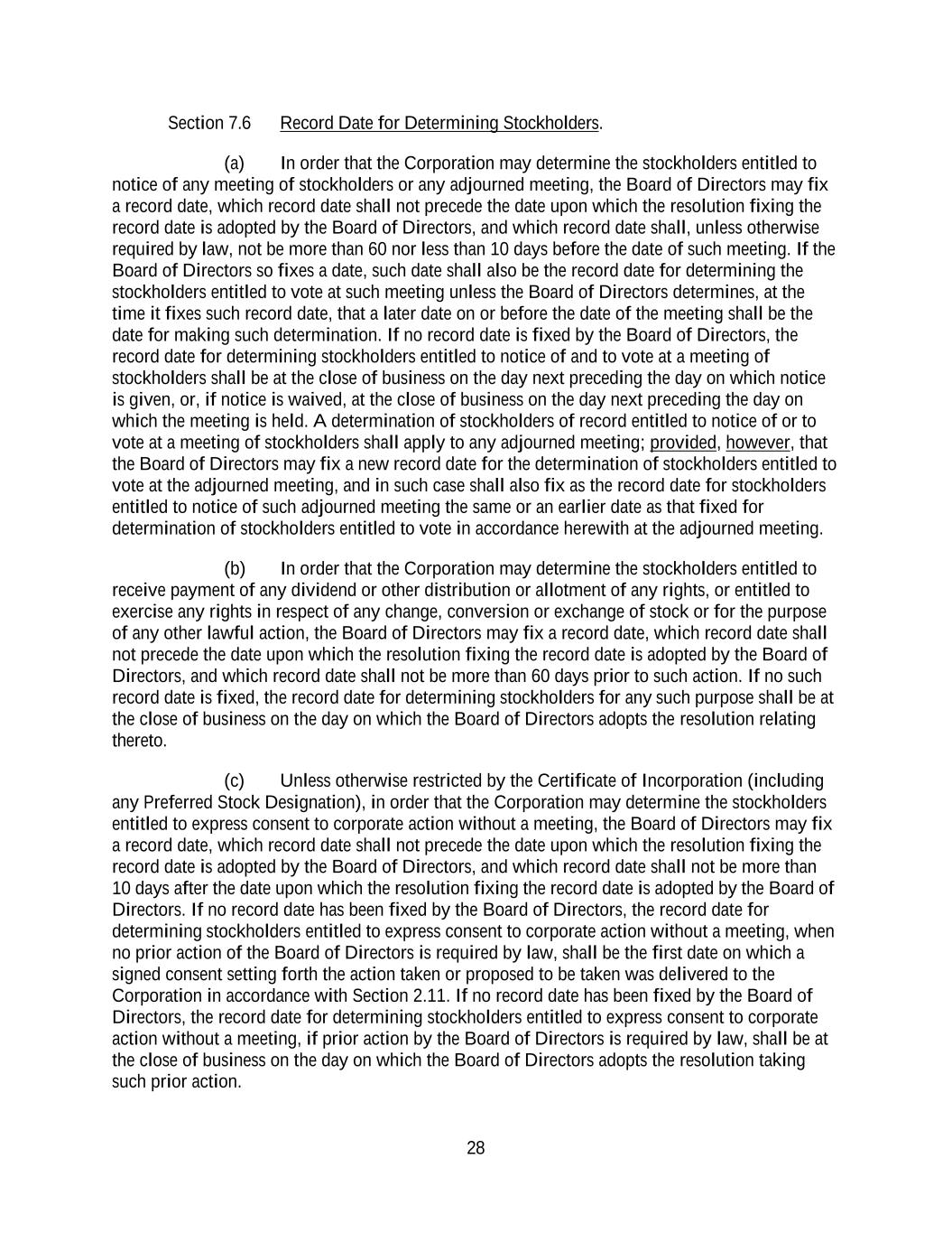 28 Section 7.6 Record Date for Determining Stockholders. (a) In order that the Corporation may determine the stockholders entitled to notice of any meeting of stockholders or any adjourned meeting, the Board of Directors may fix a record date, which record date shall not precede the date upon which the resolution fixing the record date is adopted by the Board of Directors, and which record date shall, unless otherwise required by law, not be more than 60 nor less than 10 days before the date of such meeting. If the Board of Directors so fixes a date, such date shall also be the record date for determining the stockholders entitled to vote at such meeting unless the Board of Directors determines, at the time it fixes such record date, that a later date on or before the date of the meeting shall be the date for making such determination. If no record date is fixed by the Board of Directors, the record date for determining stockholders entitled to notice of and to vote at a meeting of stockholders shall be at the close of business on the day next preceding the day on which notice is given, or, if notice is waived, at the close of business on the day next preceding the day on which the meeting is held. A determination of stockholders of record entitled to notice of or to vote at a meeting of stockholders shall apply to any adjourned meeting; provided, however, that the Board of Directors may fix a new record date for the determination of stockholders entitled to vote at the adjourned meeting, and in such case shall also fix as the record date for stockholders entitled to notice of such adjourned meeting the same or an earlier date as that fixed for determination of stockholders entitled to vote in accordance herewith at the adjourned meeting. (b) In order that the Corporation may determine the stockholders entitled to receive payment of any dividend or other distribution or allotment of any rights, or entitled to exercise any rights in respect of any change, conversion or exchange of stock or for the purpose of any other lawful action, the Board of Directors may fix a record date, which record date shall not precede the date upon which the resolution fixing the record date is adopted by the Board of Directors, and which record date shall not be more than 60 days prior to such action. If no such record date is fixed, the record date for determining stockholders for any such purpose shall be at the close of business on the day on which the Board of Directors adopts the resolution relating thereto. (c) Unless otherwise restricted by the Certificate of Incorporation (including any Preferred Stock Designation), in order that the Corporation may determine the stockholders entitled to express consent to corporate action without a meeting, the Board of Directors may fix a record date, which record date shall not precede the date upon which the resolution fixing the record date is adopted by the Board of Directors, and which record date shall not be more than 10 days after the date upon which the resolution fixing the record date is adopted by the Board of Directors. If no record date has been fixed by the Board of Directors, the record date for determining stockholders entitled to express consent to corporate action without a meeting, when no prior action of the Board of Directors is required by law, shall be the first date on which a signed consent setting forth the action taken or proposed to be taken was delivered to the Corporation in accordance with Section 2.11. If no record date has been fixed by the Board of Directors, the record date for determining stockholders entitled to express consent to corporate action without a meeting, if prior action by the Board of Directors is required by law, shall be at the close of business on the day on which the Board of Directors adopts the resolution taking such prior action.