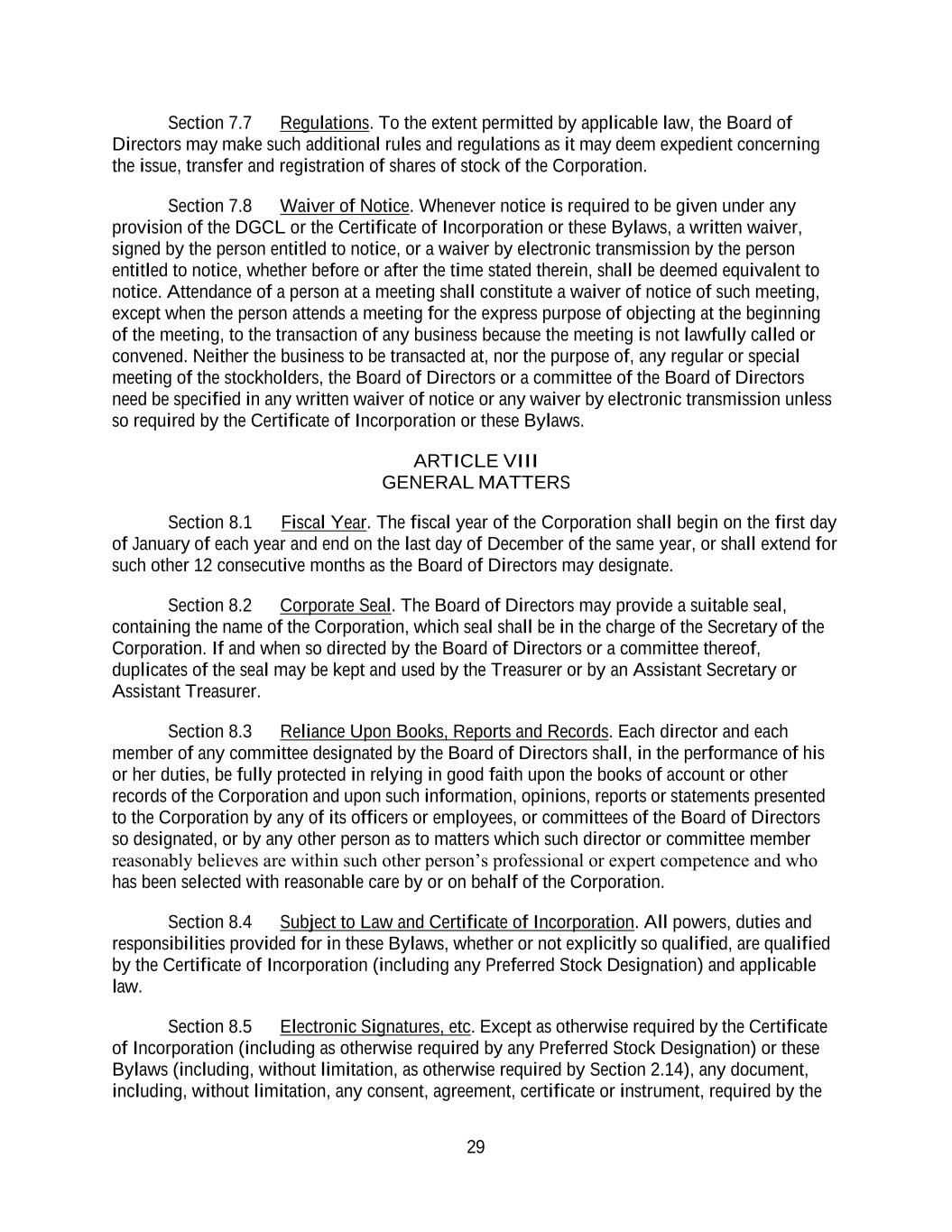 29 Section 7.7 Regulations. To the extent permitted by applicable law, the Board of Directors may make such additional rules and regulations as it may deem expedient concerning the issue, transfer and registration of shares of stock of the Corporation. Section 7.8 Waiver of Notice. Whenever notice is required to be given under any provision of the DGCL or the Certificate of Incorporation or these Bylaws, a written waiver, signed by the person entitled to notice, or a waiver by electronic transmission by the person entitled to notice, whether before or after the time stated therein, shall be deemed equivalent to notice. Attendance of a person at a meeting shall constitute a waiver of notice of such meeting, except when the person attends a meeting for the express purpose of objecting at the beginning of the meeting, to the transaction of any business because the meeting is not lawfully called or convened. Neither the business to be transacted at, nor the purpose of, any regular or special meeting of the stockholders, the Board of Directors or a committee of the Board of Directors need be specified in any written waiver of notice or any waiver by electronic transmission unless so required by the Certificate of Incorporation or these Bylaws. ARTICLE VIII GENERAL MATTERS Section 8.1 Fiscal Year. The fiscal year of the Corporation shall begin on the first day of January of each year and end on the last day of December of the same year, or shall extend for such other 12 consecutive months as the Board of Directors may designate. Section 8.2 Corporate Seal. The Board of Directors may provide a suitable seal, containing the name of the Corporation, which seal shall be in the charge of the Secretary of the Corporation. If and when so directed by the Board of Directors or a committee thereof, duplicates of the seal may be kept and used by the Treasurer or by an Assistant Secretary or Assistant Treasurer. Section 8.3 Reliance Upon Books, Reports and Records. Each director and each member of any committee designated by the Board of Directors shall, in the performance of his or her duties, be fully protected in relying in good faith upon the books of account or other records of the Corporation and upon such information, opinions, reports or statements presented to the Corporation by any of its officers or employees, or committees of the Board of Directors so designated, or by any other person as to matters which such director or committee member reasonably believes are within such other person’s professional or expert competence and who has been selected with reasonable care by or on behalf of the Corporation. Section 8.4 Subject to Law and Certificate of Incorporation. All powers, duties and responsibilities provided for in these Bylaws, whether or not explicitly so qualified, are qualified by the Certificate of Incorporation (including any Preferred Stock Designation) and applicable law. Section 8.5 Electronic Signatures, etc. Except as otherwise required by the Certificate of Incorporation (including as otherwise required by any Preferred Stock Designation) or these Bylaws (including, without limitation, as otherwise required by Section 2.14), any document, including, without limitation, any consent, agreement, certificate or instrument, required by the