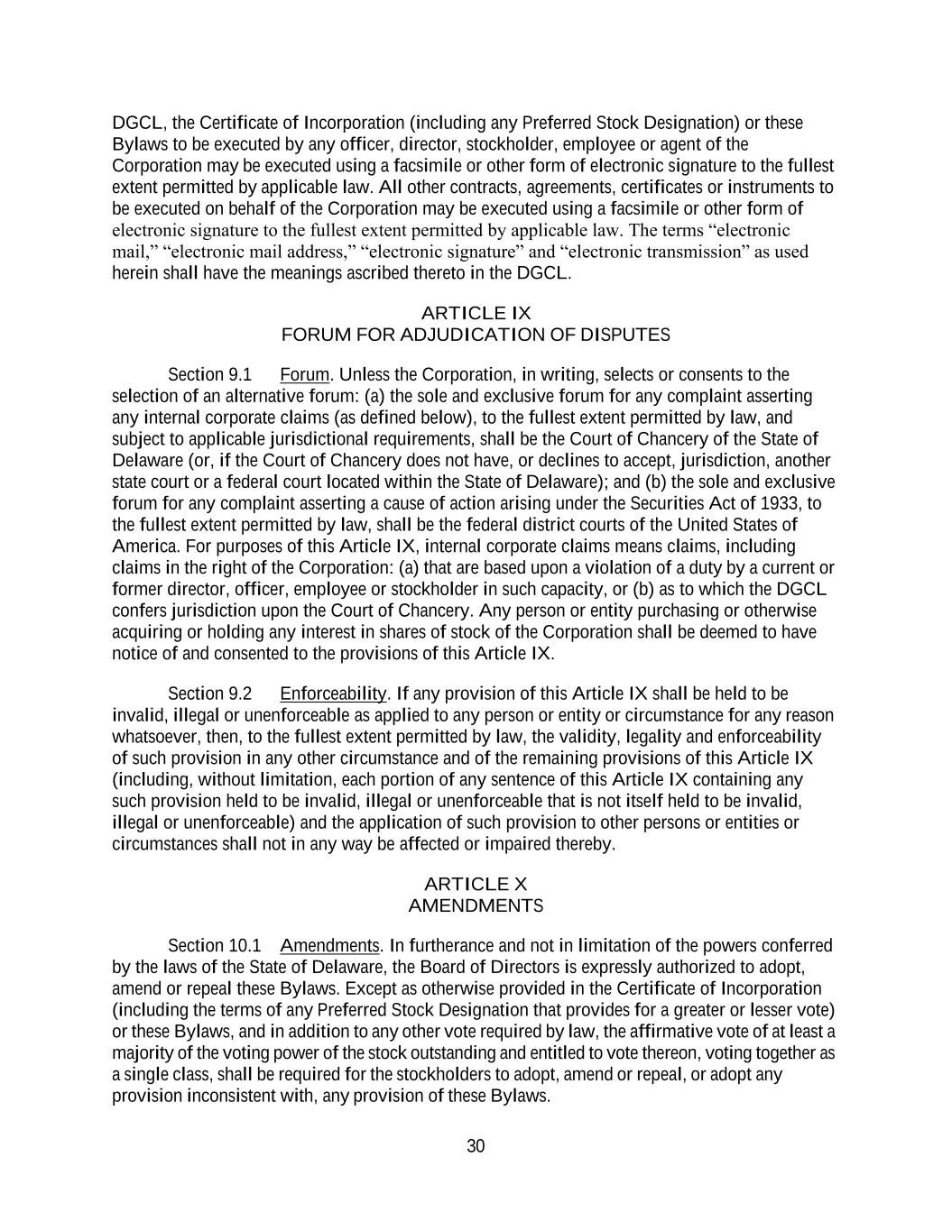 30 DGCL, the Certificate of Incorporation (including any Preferred Stock Designation) or these Bylaws to be executed by any officer, director, stockholder, employee or agent of the Corporation may be executed using a facsimile or other form of electronic signature to the fullest extent permitted by applicable law. All other contracts, agreements, certificates or instruments to be executed on behalf of the Corporation may be executed using a facsimile or other form of electronic signature to the fullest extent permitted by applicable law. The terms “electronic mail,” “electronic mail address,” “electronic signature” and “electronic transmission” as used herein shall have the meanings ascribed thereto in the DGCL. ARTICLE IX FORUM FOR ADJUDICATION OF DISPUTES Section 9.1 Forum. Unless the Corporation, in writing, selects or consents to the selection of an alternative forum: (a) the sole and exclusive forum for any complaint asserting any internal corporate claims (as defined below), to the fullest extent permitted by law, and subject to applicable jurisdictional requirements, shall be the Court of Chancery of the State of Delaware (or, if the Court of Chancery does not have, or declines to accept, jurisdiction, another state court or a federal court located within the State of Delaware); and (b) the sole and exclusive forum for any complaint asserting a cause of action arising under the Securities Act of 1933, to the fullest extent permitted by law, shall be the federal district courts of the United States of America. For purposes of this Article IX, internal corporate claims means claims, including claims in the right of the Corporation: (a) that are based upon a violation of a duty by a current or former director, officer, employee or stockholder in such capacity, or (b) as to which the DGCL confers jurisdiction upon the Court of Chancery. Any person or entity purchasing or otherwise acquiring or holding any interest in shares of stock of the Corporation shall be deemed to have notice of and consented to the provisions of this Article IX. Section 9.2 Enforceability. If any provision of this Article IX shall be held to be invalid, illegal or unenforceable as applied to any person or entity or circumstance for any reason whatsoever, then, to the fullest extent permitted by law, the validity, legality and enforceability of such provision in any other circumstance and of the remaining provisions of this Article IX (including, without limitation, each portion of any sentence of this Article IX containing any such provision held to be invalid, illegal or unenforceable that is not itself held to be invalid, illegal or unenforceable) and the application of such provision to other persons or entities or circumstances shall not in any way be affected or impaired thereby. ARTICLE X AMENDMENTS Section 10.1 Amendments. In furtherance and not in limitation of the powers conferred by the laws of the State of Delaware, the Board of Directors is expressly authorized to adopt, amend or repeal these Bylaws. Except as otherwise provided in the Certificate of Incorporation (including the terms of any Preferred Stock Designation that provides for a greater or lesser vote) or these Bylaws, and in addition to any other vote required by law, the affirmative vote of at least a majority of the voting power of the stock outstanding and entitled to vote thereon, voting together as a single class, shall be required for the stockholders to adopt, amend or repeal, or adopt any provision inconsistent with, any provision of these Bylaws.