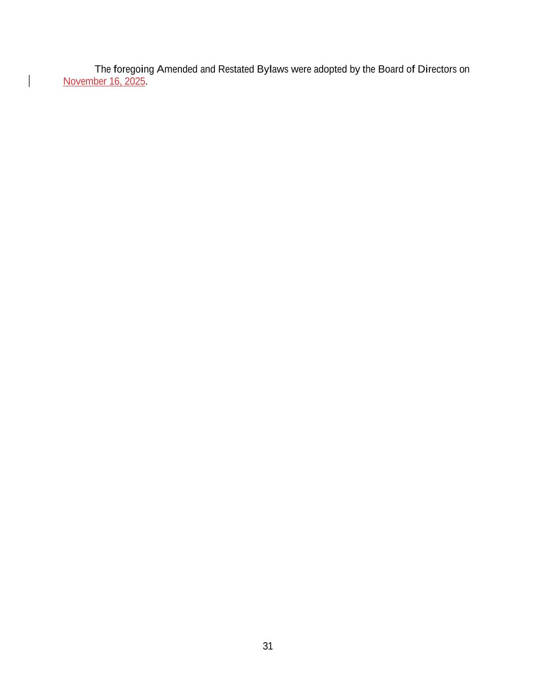 31 The foregoing Amended and Restated Bylaws were adopted by the Board of Directors on November 16, 2025.