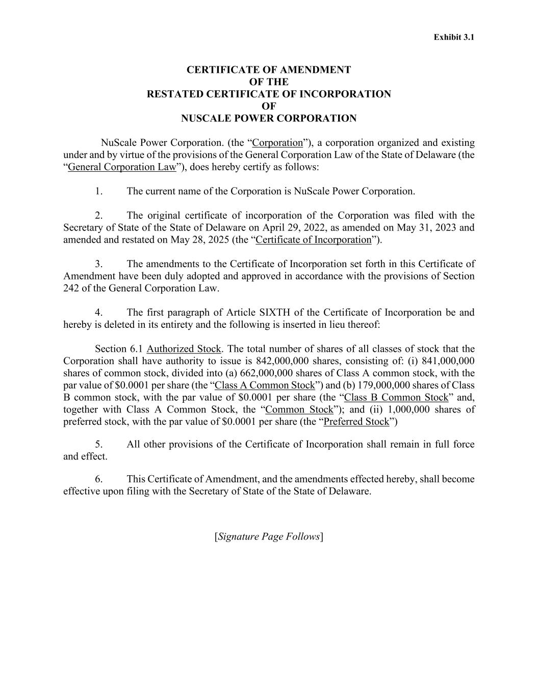Exhibit 3.1 CERTIFICATE OF AMENDMENT OF THE RESTATED CERTIFICATE OF INCORPORATION OF NUSCALE POWER CORPORATION NuScale Power Corporation. (the “Corporation”), a corporation organized and existing under and by virtue of the provisions of the General Corporation Law of the State of Delaware (the “General Corporation Law”), does hereby certify as follows: 1. The current name of the Corporation is NuScale Power Corporation. 2. The original certificate of incorporation of the Corporation was filed with the Secretary of State of the State of Delaware on April 29, 2022, as amended on May 31, 2023 and amended and restated on May 28, 2025 (the “Certificate of Incorporation”). 3. The amendments to the Certificate of Incorporation set forth in this Certificate of Amendment have been duly adopted and approved in accordance with the provisions of Section 242 of the General Corporation Law. 4. The first paragraph of Article SIXTH of the Certificate of Incorporation be and hereby is deleted in its entirety and the following is inserted in lieu thereof: Section 6.1 Authorized Stock. The total number of shares of all classes of stock that the Corporation shall have authority to issue is 842,000,000 shares, consisting of: (i) 841,000,000 shares of common stock, divided into (a) 662,000,000 shares of Class A common stock, with the par value of $0.0001 per share (the “Class A Common Stock”) and (b) 179,000,000 shares of Class B common stock, with the par value of $0.0001 per share (the “Class B Common Stock” and, together with Class A Common Stock, the “Common Stock”); and (ii) 1,000,000 shares of preferred stock, with the par value of $0.0001 per share (the “Preferred Stock”) 5. All other provisions of the Certificate of Incorporation shall remain in full force and effect. 6. This Certificate of Amendment, and the amendments effected hereby, shall become effective upon filing with the Secretary of State of the State of Delaware. [Signature Page Follows]