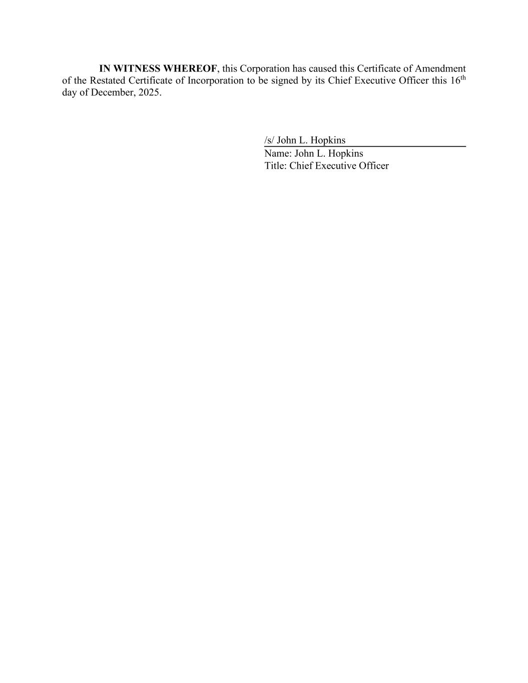 IN WITNESS WHEREOF, this Corporation has caused this Certificate of Amendment of the Restated Certificate of Incorporation to be signed by its Chief Executive Officer this 16th day of December, 2025. /s/ John L. Hopkins Name: John L. Hopkins Title: Chief Executive Officer
