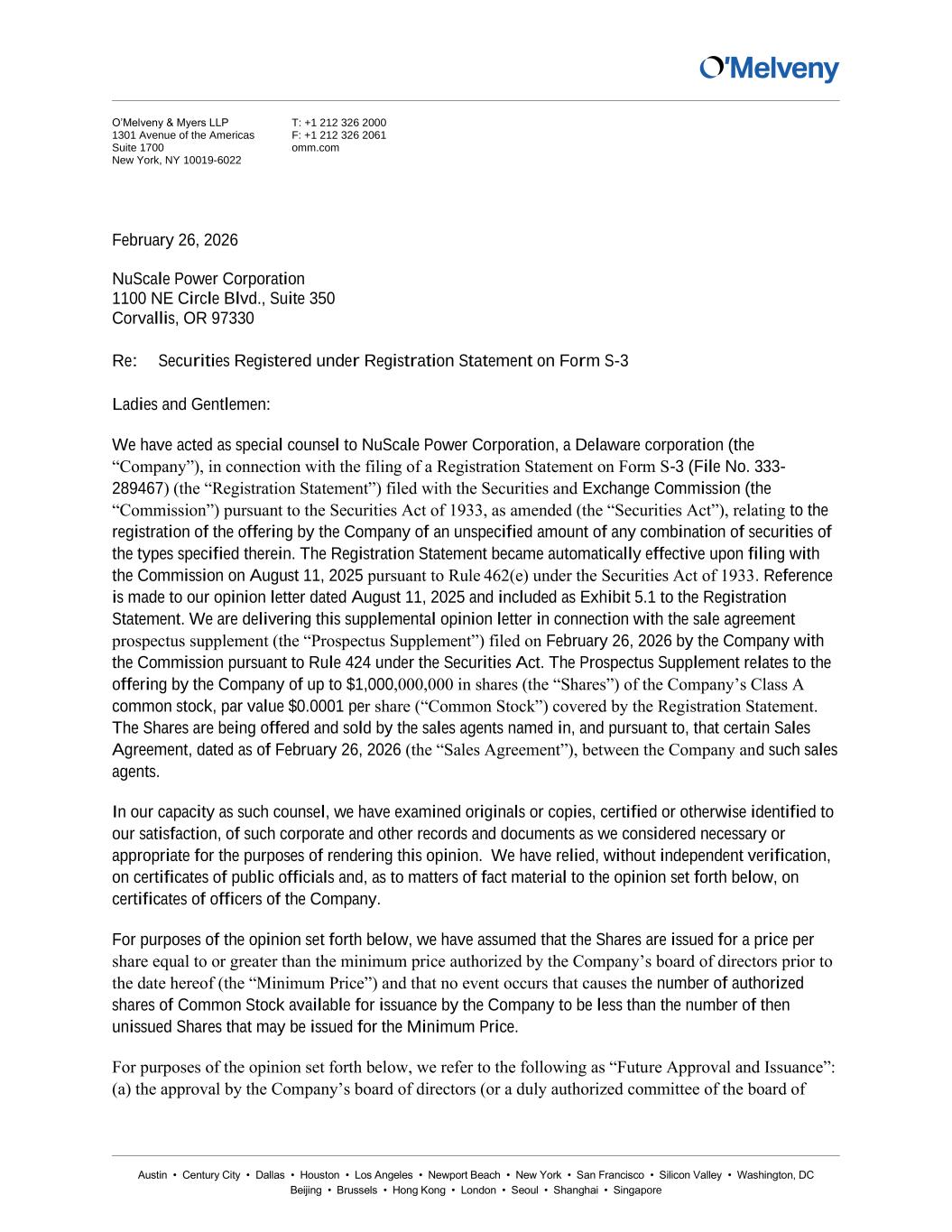 Austin • Century City • Dallas • Houston • Los Angeles • Newport Beach • New York • San Francisco • Silicon Valley • Washington, DC Beijing • Brussels • Hong Kong • London • Seoul • Shanghai • Singapore O’Melveny & Myers LLP 1301 Avenue of the Americas Suite 1700 New York, NY 10019-6022 T: +1 212 326 2000 F: +1 212 326 2061 omm.com February 26, 2026 NuScale Power Corporation 1100 NE Circle Blvd., Suite 350 Corvallis, OR 97330 Re: Securities Registered under Registration Statement on Form S-3 Ladies and Gentlemen: We have acted as special counsel to NuScale Power Corporation, a Delaware corporation (the “Company”), in connection with the filing of a Registration Statement on Form S-3 (File No. 333- 289467) (the “Registration Statement”) filed with the Securities and Exchange Commission (the “Commission”) pursuant to the Securities Act of 1933, as amended (the “Securities Act”), relating to the registration of the offering by the Company of an unspecified amount of any combination of securities of the types specified therein. The Registration Statement became automatically effective upon filing with the Commission on August 11, 2025 pursuant to Rule 462(e) under the Securities Act of 1933. Reference is made to our opinion letter dated August 11, 2025 and included as Exhibit 5.1 to the Registration Statement. We are delivering this supplemental opinion letter in connection with the sale agreement prospectus supplement (the “Prospectus Supplement”) filed on February 26, 2026 by the Company with the Commission pursuant to Rule 424 under the Securities Act. The Prospectus Supplement relates to the offering by the Company of up to $1,000,000,000 in shares (the “Shares”) of the Company’s Class A common stock, par value $0.0001 per share (“Common Stock”) covered by the Registration Statement. The Shares are being offered and sold by the sales agents named in, and pursuant to, that certain Sales Agreement, dated as of February 26, 2026 (the “Sales Agreement”), between the Company and such sales agents. In our capacity as such counsel, we have examined originals or copies, certified or otherwise identified to our satisfaction, of such corporate and other records and documents as we considered necessary or appropriate for the purposes of rendering this opinion. We have relied, without independent verification, on certificates of public officials and, as to matters of fact material to the opinion set forth below, on certificates of officers of the Company. For purposes of the opinion set forth below, we have assumed that the Shares are issued for a price per share equal to or greater than the minimum price authorized by the Company’s board of directors prior to the date hereof (the “Minimum Price”) and that no event occurs that causes the number of authorized shares of Common Stock available for issuance by the Company to be less than the number of then unissued Shares that may be issued for the Minimum Price. For purposes of the opinion set forth below, we refer to the following as “Future Approval and Issuance”: (a) the approval by the Company’s board of directors (or a duly authorized committee of the board of