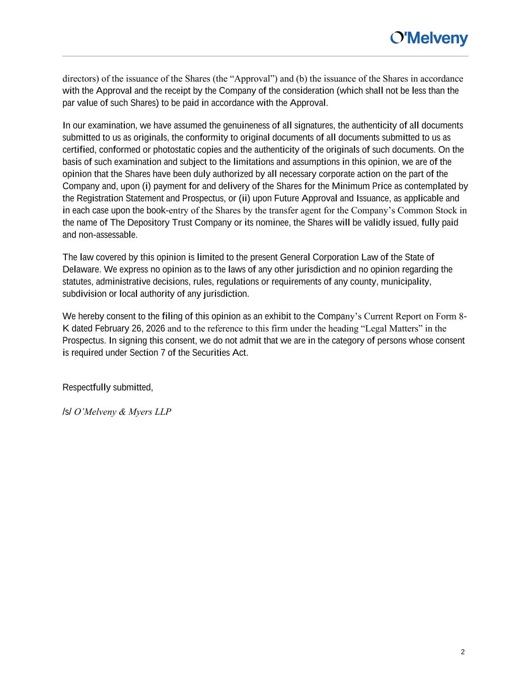 2 directors) of the issuance of the Shares (the “Approval”) and (b) the issuance of the Shares in accordance with the Approval and the receipt by the Company of the consideration (which shall not be less than the par value of such Shares) to be paid in accordance with the Approval. In our examination, we have assumed the genuineness of all signatures, the authenticity of all documents submitted to us as originals, the conformity to original documents of all documents submitted to us as certified, conformed or photostatic copies and the authenticity of the originals of such documents. On the basis of such examination and subject to the limitations and assumptions in this opinion, we are of the opinion that the Shares have been duly authorized by all necessary corporate action on the part of the Company and, upon (i) payment for and delivery of the Shares for the Minimum Price as contemplated by the Registration Statement and Prospectus, or (ii) upon Future Approval and Issuance, as applicable and in each case upon the book-entry of the Shares by the transfer agent for the Company’s Common Stock in the name of The Depository Trust Company or its nominee, the Shares will be validly issued, fully paid and non-assessable. The law covered by this opinion is limited to the present General Corporation Law of the State of Delaware. We express no opinion as to the laws of any other jurisdiction and no opinion regarding the statutes, administrative decisions, rules, regulations or requirements of any county, municipality, subdivision or local authority of any jurisdiction. We hereby consent to the filing of this opinion as an exhibit to the Company’s Current Report on Form 8- K dated February 26, 2026 and to the reference to this firm under the heading “Legal Matters” in the Prospectus. In signing this consent, we do not admit that we are in the category of persons whose consent is required under Section 7 of the Securities Act. Respectfully submitted, /s/ O’Melveny & Myers LLP