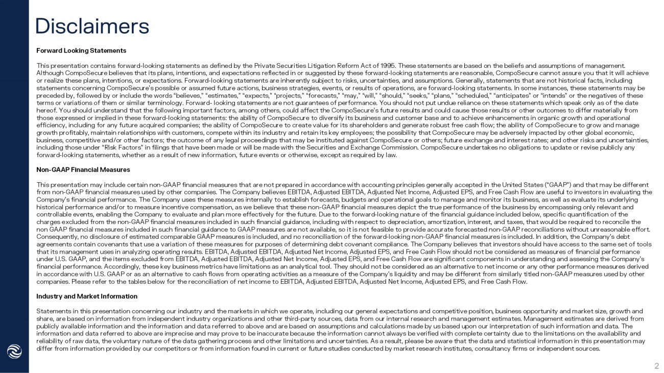 Disclaimers 2 Forward Looking Statements This presentation contains forward - looking statements as defined by the Private Securities Litigation Reform Act of 1995. These statements are based on the beliefs and assumptions of management. Although CompoSecure believes that its plans, intentions, and expectations reflected in or suggested by these forward - looking statements are reasona ble, CompoSecure cannot assure you that it will achieve or realize these plans, intentions, or expectations. Forward - looking statements are inherently subject to risks, uncertainties, and assumptions. Generally, statements that are not historical facts, including statements concerning CompoSecure’s possible or assumed future actions, business strategies, events, or results of operations , a re forward - looking statements. In some instances, these statements may be preceded by, followed by or include the words “believes,” “estimates,” “expects,” “projects,” “forecasts,” “may,” “will,” “sh oul d,” “seeks,” “plans,” “scheduled,” “anticipates” or “intends” or the negatives of these terms or variations of them or similar terminology. Forward - looking statements are not guarantees of performance. You should no t put undue reliance on these statements which speak only as of the date hereof. You should understand that the following important factors, among others, could affect the CompoSecure’s future resul ts and could cause those results or other outcomes to differ materially from those expressed or implied in these forward - looking statements: the ability of CompoSecure to diversify its business and customer base and to achieve enhancements in organic growth and operational efficiency, including for any future acquired companies; the ability of CompoSecure to create value for its shareholders and generate robust free cash flow; the ability of CompoSecure to grow and manage growth profitably, maintain relationships with customers, compete within its industry and retain its key employees; the possi bil ity that CompoSecure may be adversely impacted by other global economic, business, competitive and/or other factors; the outcome of any legal proceedings that may be instituted against CompoSecure or others; future exchange and interest rates; and other risks and uncertainties, including those under “Risk Factors” in filings that have been made or will be made with the Securities and Exchange Commissi on. CompoSecure undertakes no obligations to update or revise publicly any forward - looking statements, whether as a result of new information, future events or otherwise, except as required by law. Non - GAAP Financial Measures This presentation may include certain non - GAAP financial measures that are not prepared in accordance with accounting principles generally accepted in the United States (“GAAP”) and that may be different from non - GAAP financial measures used by other companies. The Company believes EBITDA, Adjusted EBITDA, Adjusted Net Income, Adj usted EPS, and Free Cash Flow are useful to investors in evaluating the Company’s financial performance. The Company uses these measures internally to establish forecasts, budgets and operational g oal s to manage and monitor its business, as well as evaluate its underlying historical performance and/or to measure incentive compensation, as we believe that these non - GAAP financial measures depict the true performance of the business by encompassing only relevant and controllable events, enabling the Company to evaluate and plan more effectively for the future. Due to the forward - looking natur e of the financial guidance included below, specific quantification of the charges excluded from the non - GAAP financial measures included in such financial guidance, including with respect to depreciatio n, amortization, interest, and taxes, that would be required to reconcile the non GAAP financial measures included in such financial guidance to GAAP measures are not available, so it is not feasible to pro vide accurate forecasted non - GAAP reconciliations without unreasonable effort. Consequently, no disclosure of estimated comparable GAAP measures is included, and no reconciliation of the forward - looking non - GAAP financial measures is included. In addition, the Company’s debt agreements contain covenants that use a variation of these measures for purposes of determining debt covenant compliance. The Co mpany believes that investors should have access to the same set of tools that its management uses in analyzing operating results. EBITDA, Adjusted EBITDA, Adjusted Net Income, Adjusted EPS, and Free Ca sh Flow should not be considered as measures of financial performance under U.S. GAAP, and the items excluded from EBITDA, Adjusted EBITDA, Adjusted Net Income, Adjusted EPS, and Free Cash Flow a re significant components in understanding and assessing the Company’s financial performance. Accordingly, these key business metrics have limitations as an analytical tool. They should not be con sid ered as an alternative to net income or any other performance measures derived in accordance with U.S. GAAP or as an alternative to cash flows from operating activities as a measure of the Company’s liqui dit y and may be different from similarly titled non - GAAP measures used by other companies. Please refer to the tables below for the reconciliation of net income to EBITDA, Adjusted EBITDA, Adjusted Net Inc ome , Adjusted EPS, and Free Cash Flow. Industry and Market Information Statements in this presentation concerning our industry and the markets in which we operate, including our general expectatio ns and competitive position, business opportunity and market size, growth and share, are based on information from independent industry organizations and other third - party sources, data from our internal re search and management estimates. Management estimates are derived from publicly available 