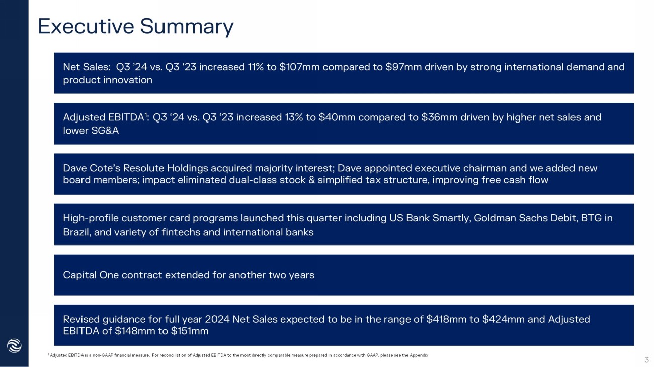 Executive Summary Revised guidance for f ull y ear 2024 Net Sales expected to be in the range of $ 418 mm to $ 424 mm a nd Adjusted EBITDA of $148mm to $151mm Dave Cote’s Resolute Holdings acquired majority interest; Dave appointed executive chairman and we added new board members; impact eliminated dual - class stock & simplified tax structure, improving free cash flow Net Sales: Q3 ’24 vs. Q3 ‘23 increased 11% to $107mm compared to $97mm driven by strong international demand and product innovation 1 Adjusted EBITDA is a non - GAAP financial measure. For reconciliation of Adjusted EBITDA to the most directly comparable measure prepared in accordance with GAAP, please see the Appendix Adjusted EBITDA 1 : Q3 ‘24 vs. Q3 ‘23 increased 13% to $40mm compared to $36mm driven by higher net sales and lower SG&A High - profile customer card programs launched this quarter including US Bank Smartly, Goldman Sachs Debit, BTG in Brazil, and variety of fintechs and international banks 3 Capital One contract extended for another two years