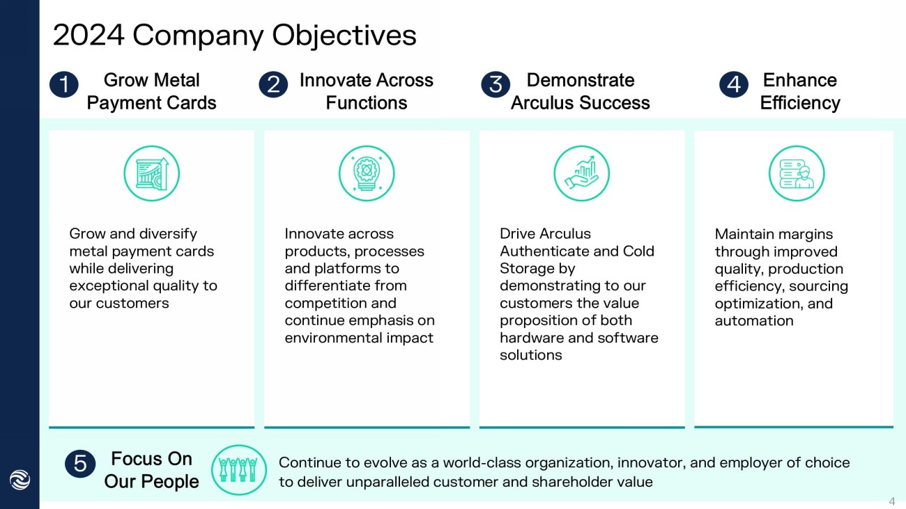 2024 Company Objectives Grow and diversify metal payment cards while delivering exceptional quality to our customers Innovate across products, processes and platforms to differentiate from competition and continue emphasis on environmental impact Drive Arculus Authenticate and Cold Storage by demonstrating to our customers the value proposition of both hardware and software solutions Maintain margins through improved quality, production efficiency, sourcing optimization, and automation Grow Metal Payment Cards Innovate Across Functions Demonstrate Arculus Success Enhance Efficiency 1 4 3 2 Continue to evolve as a world - class organization, innovator, and employer of choice to deliver unparalleled customer and shareholder value Focus On Our People 5 4