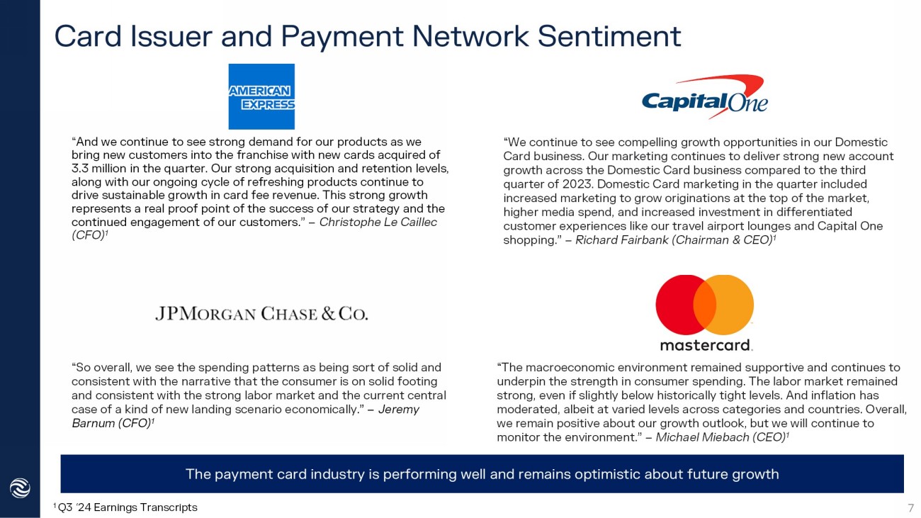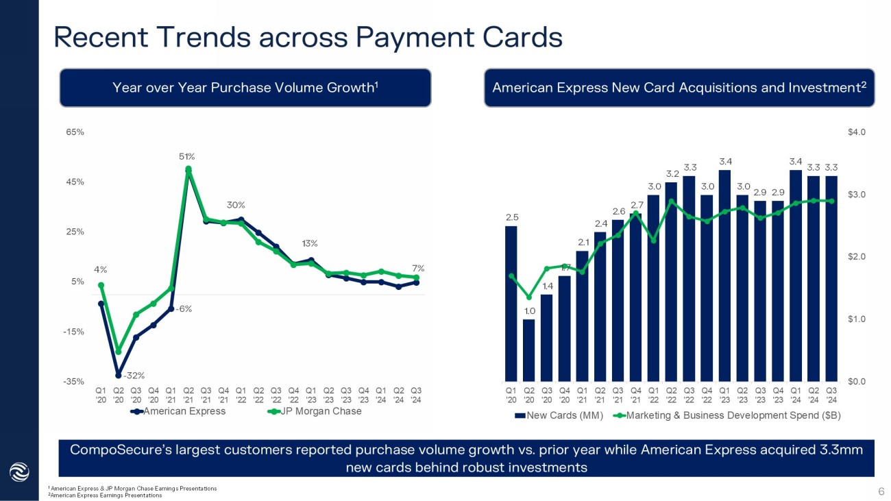 Recent Trends across Payment Cards 1 American Express & JP Morgan Chase Earnings Presentations 2 American Express Earnings Presentations Year over Year Purchase Volume Growth 1 American Express New Card Acquisitions and Investment 2 - 32% - 6% 30% 4% 51% 13% 7% -35% -15% 5% 25% 45% 65% Q1 '20 Q2 '20 Q3 '20 Q4 '20 Q1 '21 Q2 '21 Q3 '21 Q4 '21 Q1 '22 Q2 '22 Q3 '22 Q4 '22 Q1 '23 Q2 '23 Q3 '23 Q4 '23 Q1 '24 Q2 '24 Q3 '24 American Express JP Morgan Chase 2.5 1.0 1.4 1.7 2.1 2.4 2.6 2.7 3.0 3.2 3.3 3.0 3.4 3.0 2.9 2.9 3.4 3.3 3.3 - 0.5 1.0 1.5 2.0 2.5 3.0 3.5 4.0 Q1 '20 Q2 '20 Q3 '20 Q4 '20 Q1 '21 Q2 '21 Q3 '21 Q4 '21 Q1 '22 Q2 '22 Q3 '22 Q4 '22 Q1 '23 Q2 '23 Q3 '23 Q4 '23 Q1 '24 Q2 '24 Q3 '24 $0.0 $1.0 $2.0 $3.0 $4.0 New Cards (MM) Marketing & Business Development Spend ($B) 6 CompoSecure’s largest customers reported purchase volume growth vs. prior year while American Express acquired 3.3mm new cards behind robust investments