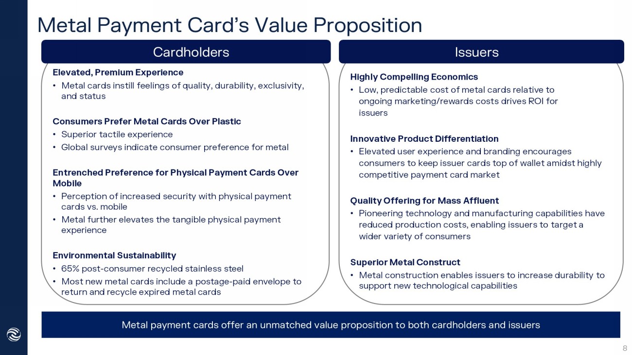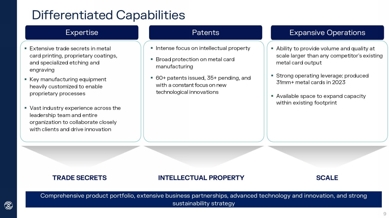 Cardholders Issuers Elevated, Premium Experience • Metal cards instill feelings of quality, durability, exclusivity, and status Consumers Prefer Metal Cards Over Plastic • Superior tactile experience • Global surveys indicate consumer preference for metal Entrenched Preference for Physical Payment Cards Over Mobile • Perception of increased security with physical payment cards vs. mobile • Metal further elevates the tangible physical payment experience Environmental Sustainability • 65% post - consumer recycled stainless steel • Most new metal cards include a postage - paid envelope to return and recycle expired metal cards Highly Compelling Economics • Low, predictable cost of metal cards relative to ongoing marketing/rewards costs drives ROI for issuers Innovative Product Differentiation • Elevated user experience and branding encourages consumers to keep issuer cards top of wallet amidst highly competitive payment card market Quality Offering for Mass Affluent • Pioneering technology and manufacturing capabilities have reduced production costs, enabling issuers to target a wider variety of consumers Superior Metal Construct • Metal construction enables issuers to increase durability to support new technological capabilities Metal Payment Card’s Value Proposition 8 Metal payment cards offer an unmatched value proposition to both cardholders and issuers