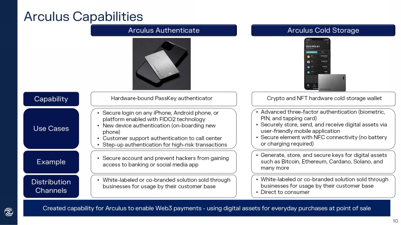 Arculus Capabilities Arculus Authenticate Arculus Cold Storage Hardware - bound PassKey authenticator • Secure login on any iPhone, Android phone, or platform enabled with FIDO2 technology • New device authentication (on - boarding new phone) • Customer support authentication to call center • Step - up authentication for high - risk transactions • Secure account and prevent hackers from gaining access to banking or social media app • White - labeled or co - branded solution sold through businesses for usage by their customer base • Generate, store, and secure keys for digital assets such as Bitcoin, Ethereum, Cardano, Solano, and many more • White - labeled or co - branded solution sold through businesses for usage by their customer base • Direct to consumer Capability Use Cases Example Distribution Channels Crypto and NFT hardware cold storage wallet • Advanced three - factor authentication (biometric, PIN, and tapping card) • Securely store, send, and receive digital assets via user - friendly mobile application • Secure element with NFC connectivity (no battery or charging required) 10 Created capability for Arculus to enable Web3 payments - using digital assets for everyday purchases at point of sale