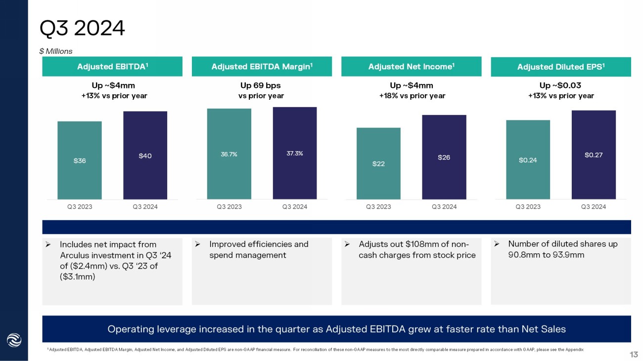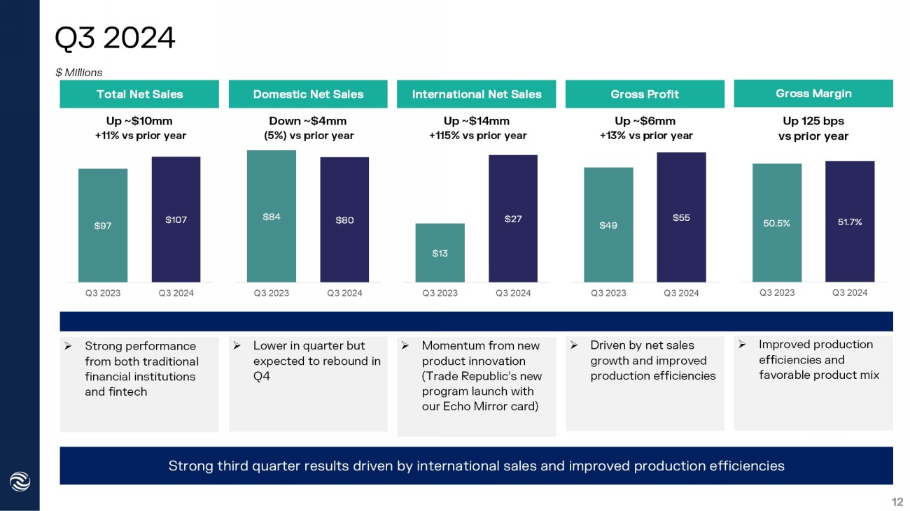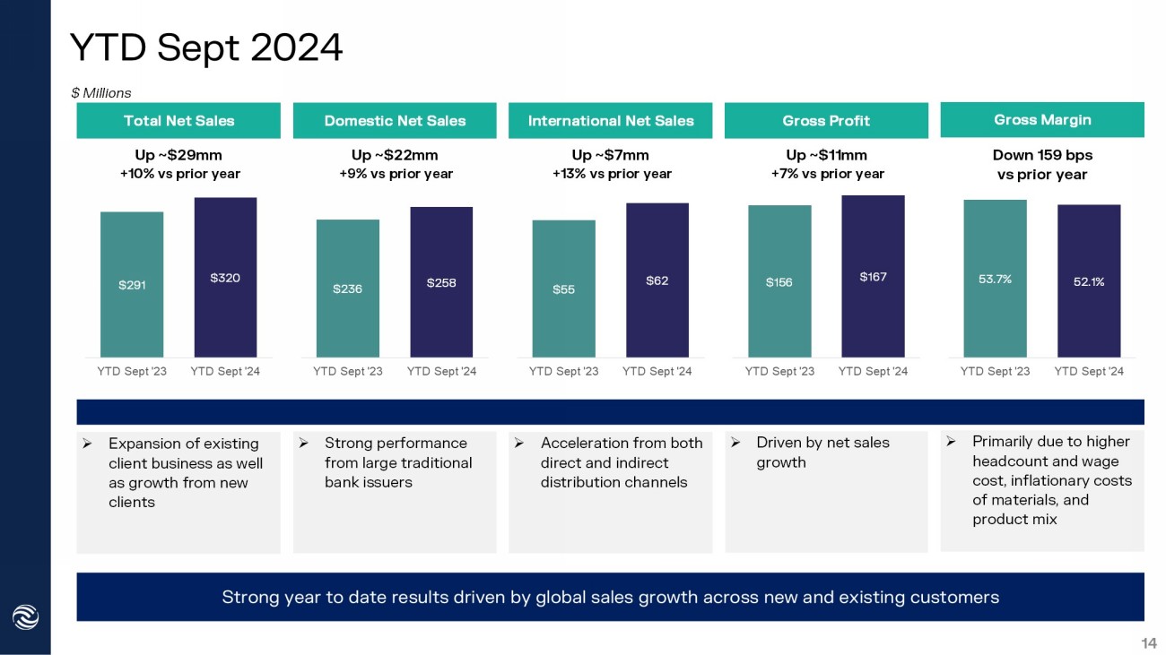 $49 $55 Q3 2023 Q3 2024 $13 $27 Q3 2023 Q3 2024 $84 $80 Q3 2023 Q3 2024 $97 $107 Q3 2023 Q3 2024 Q3 2024 12 Total Net Sales » Lower in quarter but expected to rebound in Q4 » Strong performance from both traditional financial institutions and fintech » Momentum from new product innovation ( Trade Republic’s new program launch with our Echo Mirror card ) Strong third quarter results driven by international sales and improved production efficiencies » Driven by net sales growth and improved production efficiencies Domestic Net Sales International Net Sales Gross Profit Gross Margin 50.5% 51.7% Q3 2023 Q3 2024 » Improved production efficiencies and favorable product mix Up ~$10mm +11% vs prior year Down ~$4mm (5%) vs prior year Up ~$14mm +115% vs prior year Up ~$6mm +13% vs prior year Up 125 bps vs prior year $ Millions