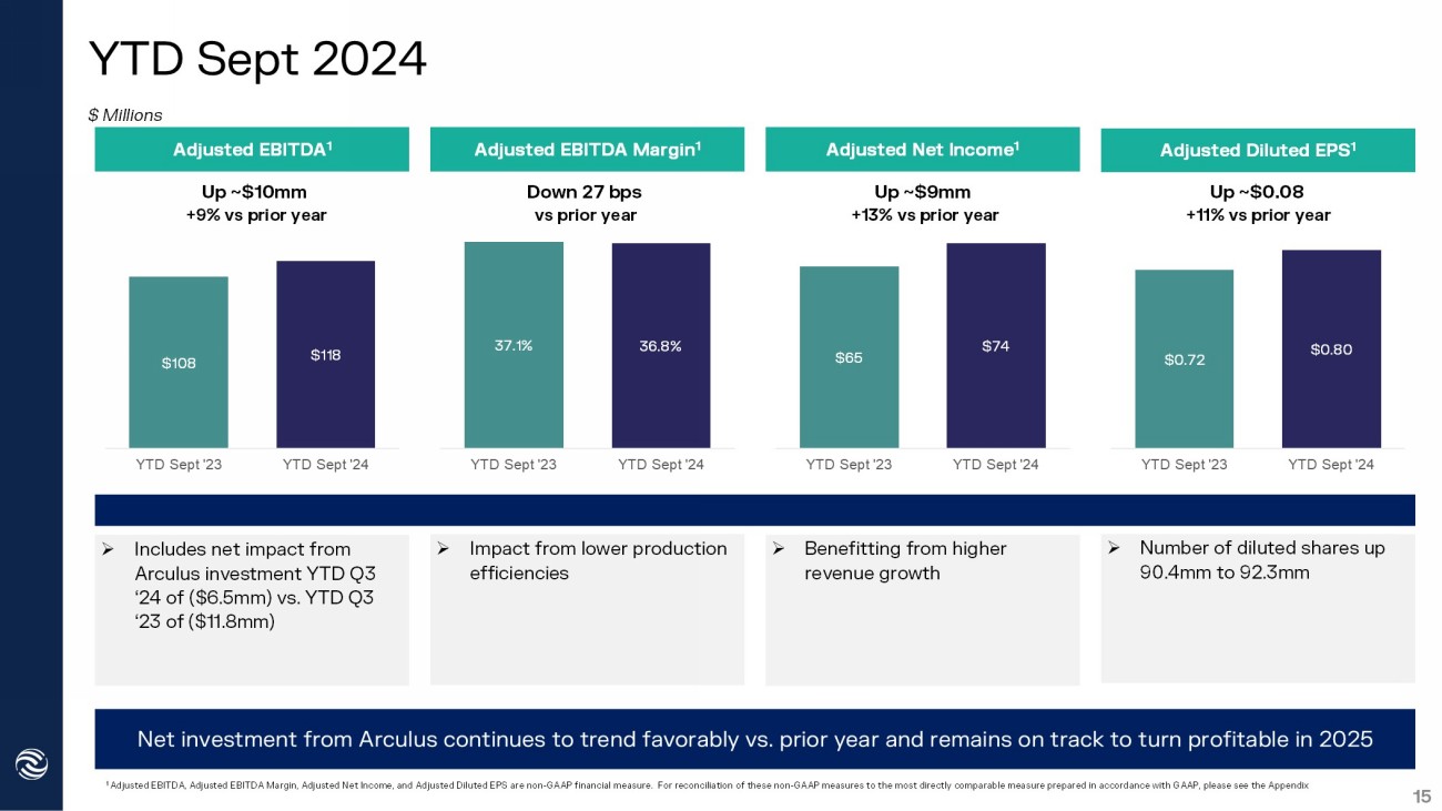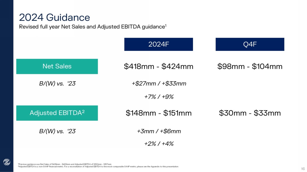 $0.72 $0.80 YTD Sept '23 YTD Sept '24 $65 $74 YTD Sept '23 YTD Sept '24 37.1% 36.8% YTD Sept '23 YTD Sept '24 $108 $118 YTD Sept '23 YTD Sept '24 YTD Sept 2024 15 » Impact from lower production efficiencies » Includes net impact from Arculus investment YTD Q3 ‘24 of ($6.5mm) vs. YTD Q3 ‘23 of ($11.8mm) » Benefitting from higher revenue growth Net investment from Arculus continues to trend favorably vs. prior year and remains on track to turn profitable in 2025 » Number of diluted shares up 90.4mm to 92.3mm Up ~$10mm +9% vs prior year Down 27 bps vs prior year Up ~$9mm +13% vs prior year Up ~$0.08 +11% vs prior year $ Millions 1 Adjusted EBITDA, Adjusted EBITDA Margin, Adjusted Net Income, and Adjusted Diluted EPS are non - GAAP financial measure. For reco nciliation of these non - GAAP measures to the most directly comparable measure prepared in accordance with GAAP, please see the A ppendix Adjusted EBITDA 1 Adjusted EBITDA Margin 1 Adjusted Net Income 1 Adjusted Diluted EPS 1