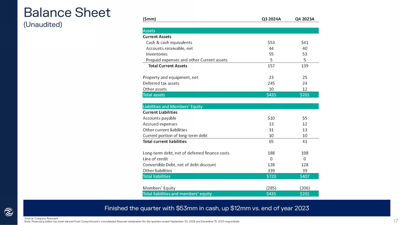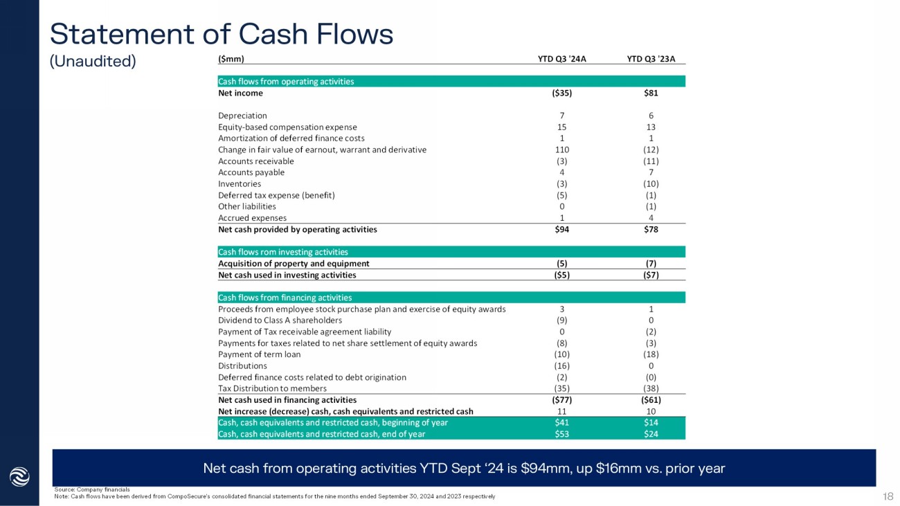 Statement of Cash Flows (Unaudited) Source: Company financials Note: Cash flows have been derived from CompoSecure’s consolidated financial statements for the nine months ended September 3 0, 2024 and 2023 respectively YTD Q3 '23A YTD Q3 '24A ($mm) Cash flows from operating activities $81 ($35) Net income 6 7 Depreciation 13 15 Equity - based compensation expense 1 1 Amortization of deferred finance costs (12) 110 Change in fair value of earnout, warrant and derivative (11) (3) Accounts receivable 7 4 Accounts payable (10) (3) Inventories (1) (5) Deferred tax expense (benefit) (1) 0 Other liabilities 4 1 Accrued expenses $78 $94 Net cash provided by operating activities Cash flows rom investing activities (7) (5) Acquisition of property and equipment ($7) ($5) Net cash used in investing activities Cash flows from financing activities 1 3 Proceeds from employee stock purchase plan and exercise of equity awards 0 (9) Dividend to Class A shareholders (2) 0 Payment of Tax receivable agreement liability (3) (8) Payments for taxes related to net share settlement of equity awards (18) (10) Payment of term loan 0 (16) Distributions (0) (2) Deferred finance costs related to debt origination (38) (35) Tax Distribution to members ($61) ($77) Net cash used in financing activities 10 11 Net increase (decrease) cash, cash equivalents and restricted cash $14 $41 Cash, cash equivalents and restricted cash, beginning of year $24 $53 Cash, cash equivalents and restricted cash, end of year 18 Net cash from operating activities YTD Sept ‘24 is $94mm, up $16mm vs. prior year
