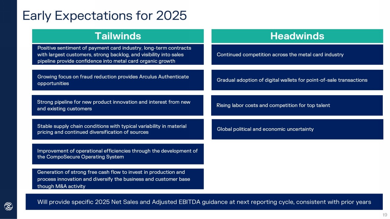 Early Expectations for 2025 Stable supply chain conditions with typical variability in material pricing and continued diversification of sources Positive sentiment of payment card industry, long - term contracts with largest customers, strong backlog, and visibility into sales pipeline provide confidence into metal card organic growth Growing focus on fraud reduction provides Arculus Authenticate opportunities Generation of strong free cash flow to invest in production and process innovation and diversify the business and customer base though M&A activity 19 Improvement of operational efficiencies through the development of the CompoSecure Operating System Global political and economic uncertainty Continued competition across the metal card industry Gradual adoption of digital wallets for point - of - sale transactions Tailwinds Headwinds Strong pipeline for new product innovation and interest from new and existing customers Rising labor costs and competition for top talent Will provide specific 2025 Net Sales and Adjusted EBITDA guidance at next reporting cycle, consistent with prior years