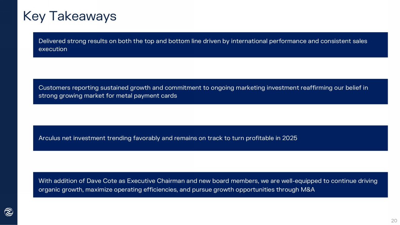 Key Takeaways Arculus net investment trending favorably and remains on track to turn profitable in 2025 Delivered strong results on both the top and bottom line driven by international performance and consistent sales execution Customers reporting sustained growth and commitment to ongoing marketing investment reaffirming our belief in strong growing market for metal payment cards With addition of Dave Cote as Executive Chairman and new board members, we are well - equipped to continue driving organic growth, maximize operating efficiencies, and pursue growth opportunities through M&A 20
