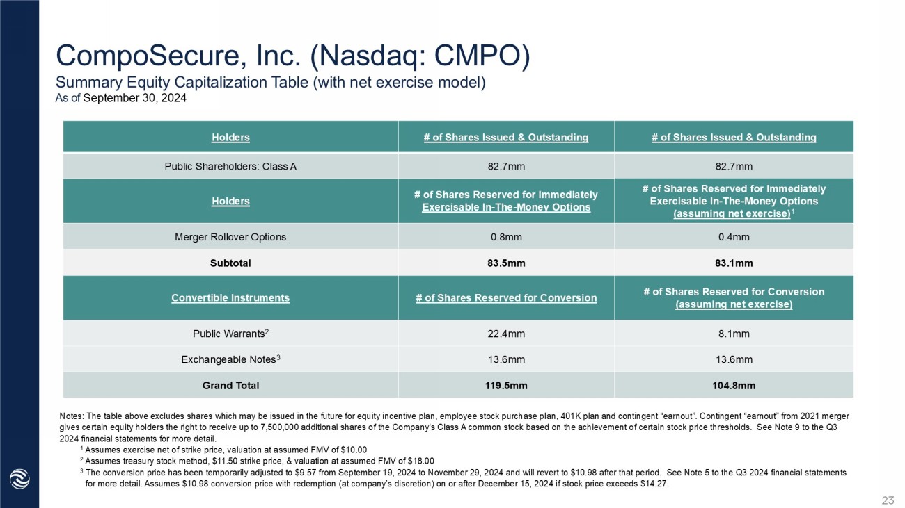 CompoSecure , Inc. (Nasdaq: CMPO) Summary Equity Capitalization Table (with net exercise model) As of September 30, 2024 # of Shares Issued & Outstanding # of Shares Issued & Outstanding Holders 82.7mm 82.7mm Public Shareholders: Class A # of Shares Reserved for Immediately Exercisable In - The - Money Options (assuming net exercise) 1 # of Shares Reserved for Immediately Exercisable In - The - Money Options Holders 0.4mm 0.8mm Merger Rollover Options 83.1mm 83.5mm Subtotal # of Shares Reserved for Conversion (assuming net exercise) # of Shares Reserved for Conversion Convertible Instruments 8.1mm 22.4mm Public Warrants 2 13.6 mm 13 . 6 mm Exchangeable Notes 3 10 4.8 mm 119.5 mm Grand Total Notes: The table above excludes shares which may be issued in the future for equity incentive plan, employee stock purchase p lan , 401K plan and contingent “earnout”. Contingent “earnout” from 2021 merger gives certain equity holders the right to receive up to 7,500,000 additional shares of the Company's Class A common stock bas ed on the achievement of certain stock price thresholds. See Note 9 to the Q3 2024 financial statements for more detail. 1 Assumes exercise net of strike price, valuation at assumed FMV of $10.00 2 Assumes treasury stock method, $11.50 strike price, & valuation at assumed FMV of $18.00 3 The conversion price has been temporarily adjusted to $9.57 from September 19, 2024 to November 29, 2024 and will revert to $ 10. 98 after that period. See Note 5 to the Q3 2024 financial statements for more detail. Assumes $10.98 conversion price with redemption (at company’s discretion) on or after December 15, 2024 if s toc k price exceeds $14.27. 23